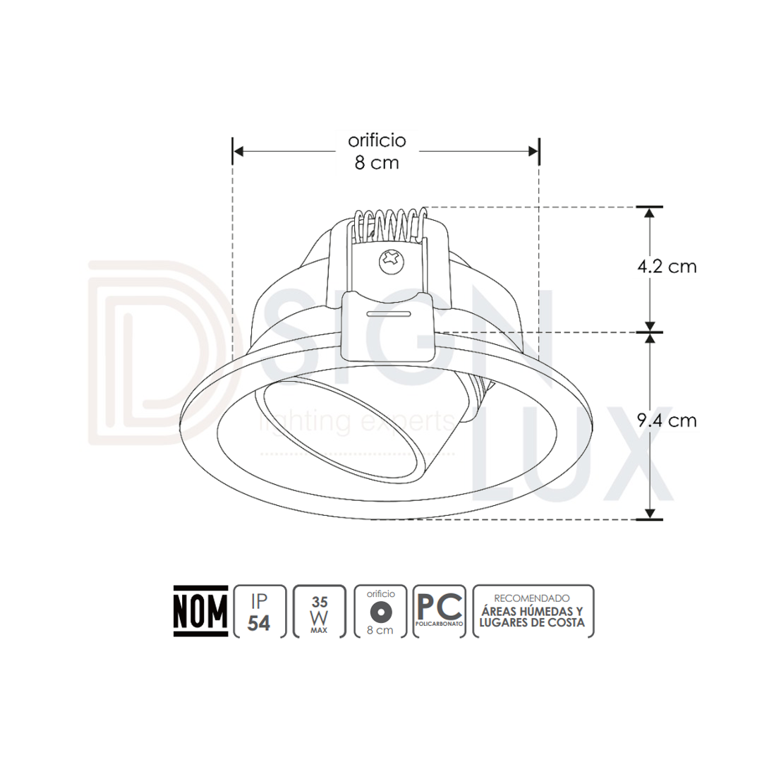 Difusor redondo semiprofundo dirigible para lámpara tipo dicroica MR16, GU10 o módulo de LED, policarbonato blanco, incluye conector GU10, IP54. ILUPC119DIRE – ILUMILEDS