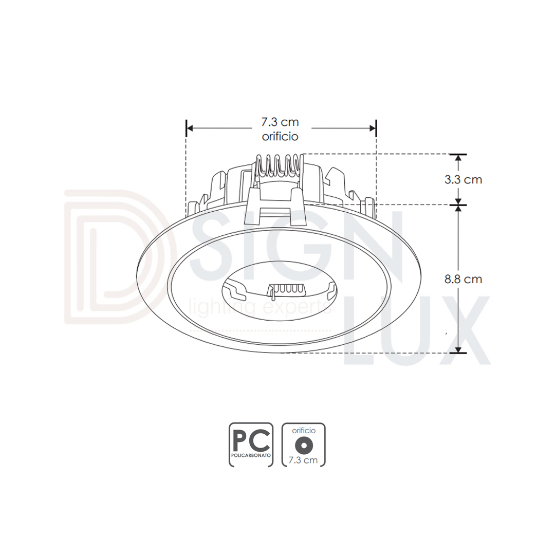 Difusor redondo dirigible, pin hole de policarbonato para foco tipo dicroica MR16, GU10 o módulo de LEDs, incluye conector MR16, IP54.