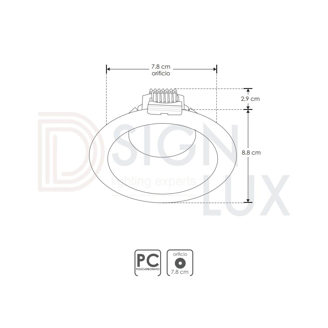 Difusor redondo semiprofundo fijo, de policarbonato para lampara tipo dicroica MR16 y GU10 o módulo de LEDs, incluye conector MR16, IP54.
