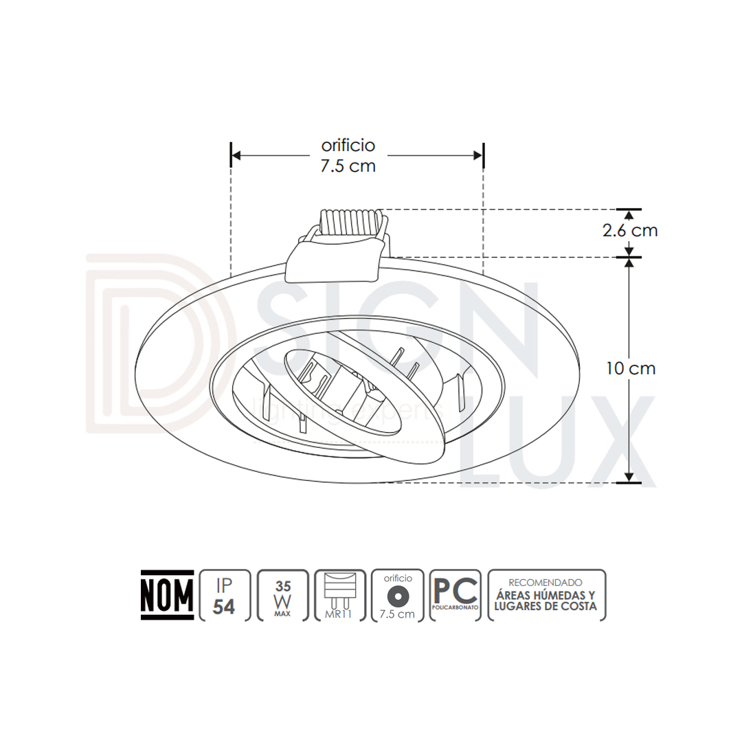 Difusor redondo dirigible para foco tipo MR11, policarbonato blanco, incluye conector MR16, IP54. ILUPC160DIRWE – ILUMILEDS