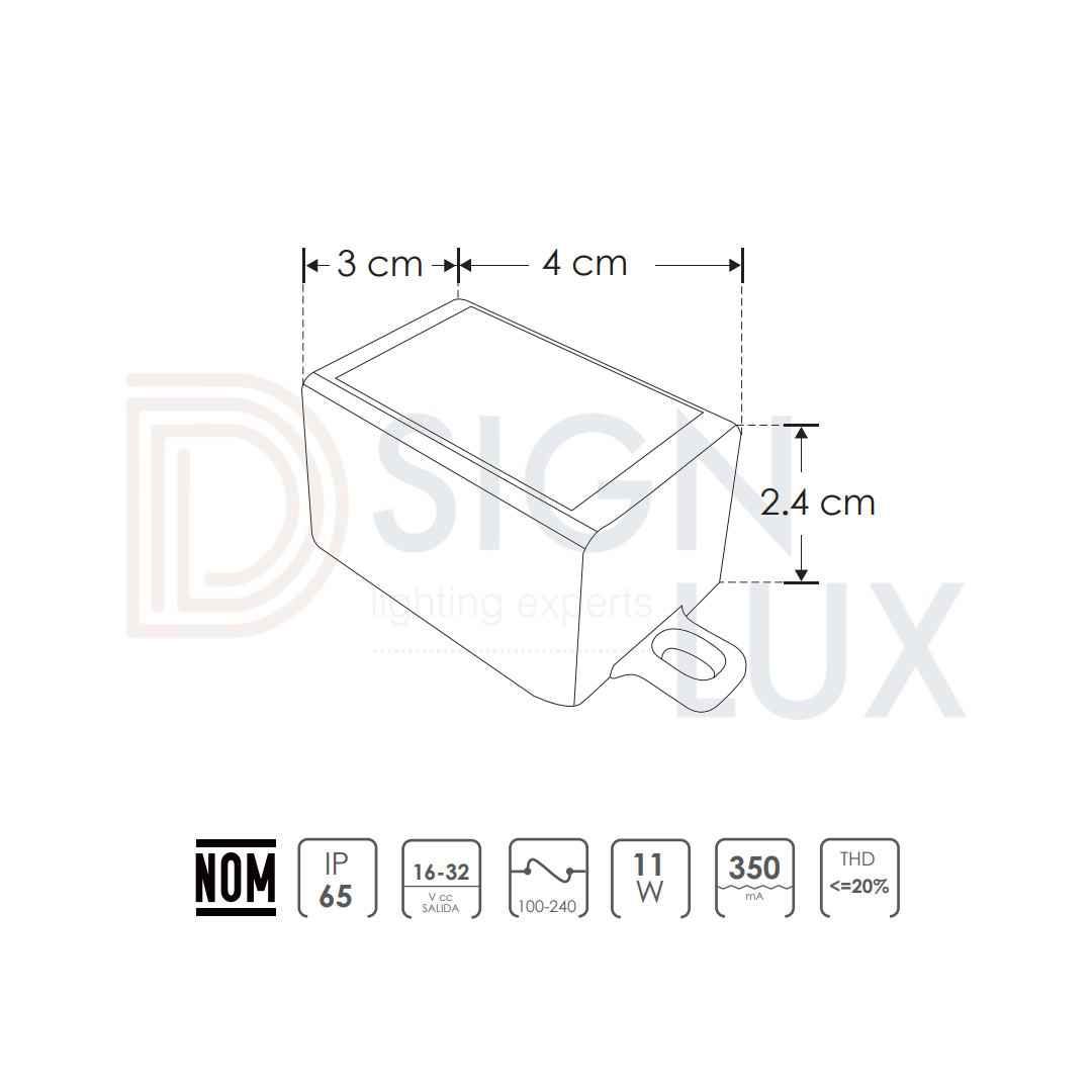 Driver para luminario de led (controlador LED) 11 Watts máximo entrada 100-240V ca salida 16-32V cc 350mA protección IP65 alto factor de potencia y baja THD. DHPFMV11W350 – ILUMILEDS