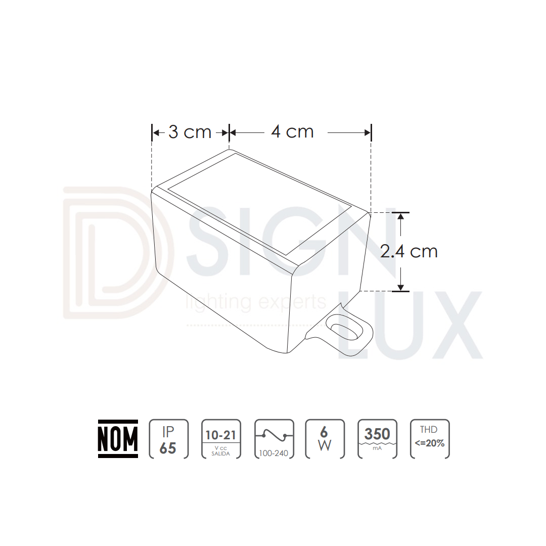 Driver para luminario de LED, (controlador LED) 6 Watts máximo, entrada 100-240 V ca salida 10-21 V cc, 350mA protección IP65, alto factor de potencia y baja THD. DHPFMV6W350 – ILUMILEDS