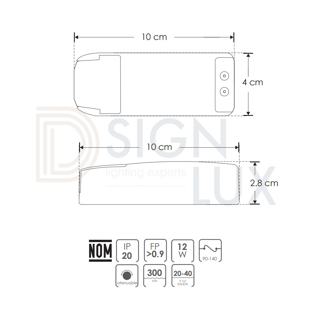 Driver atenuable para luminarios de led (controlador led) atenuado por dimmer triac 12 Watts entrada 90-140V ca salida 20-40V cc 300 ma protección IP20. DD204030012W – ILUMILEDS