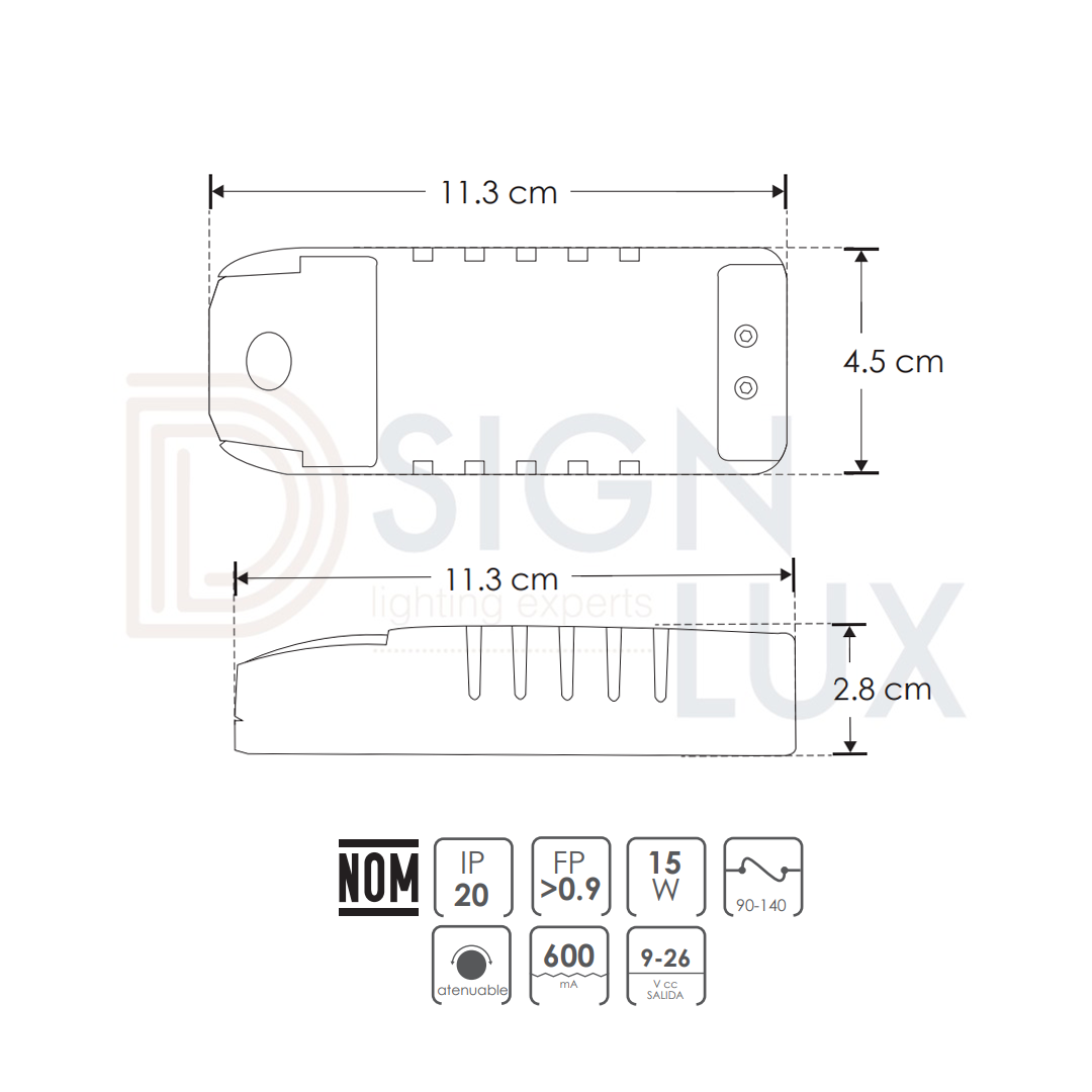 Driver atenuable para luminarios led 15 Watts funciona con atenuadores tipo TRIAC con apagador, nivel de atenuación del 20 al 100%, IP20.