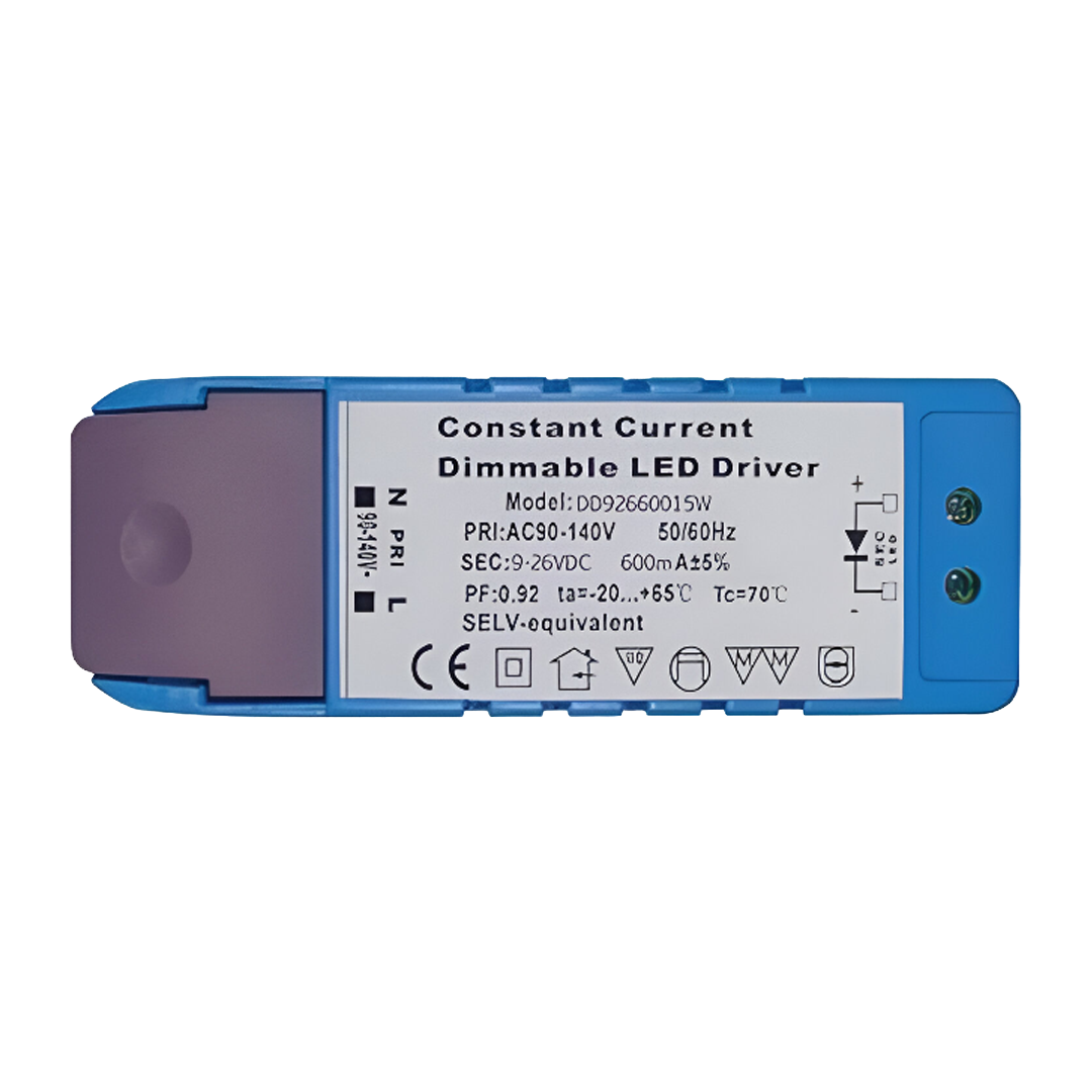 Driver atenuable para luminarios de led (controlador led) atenuado por dimmer triac 15 Watts entrada 90-140V ca salida 9-26V cc 600 ma protección IP20. DD92660015W – ILUMILEDS