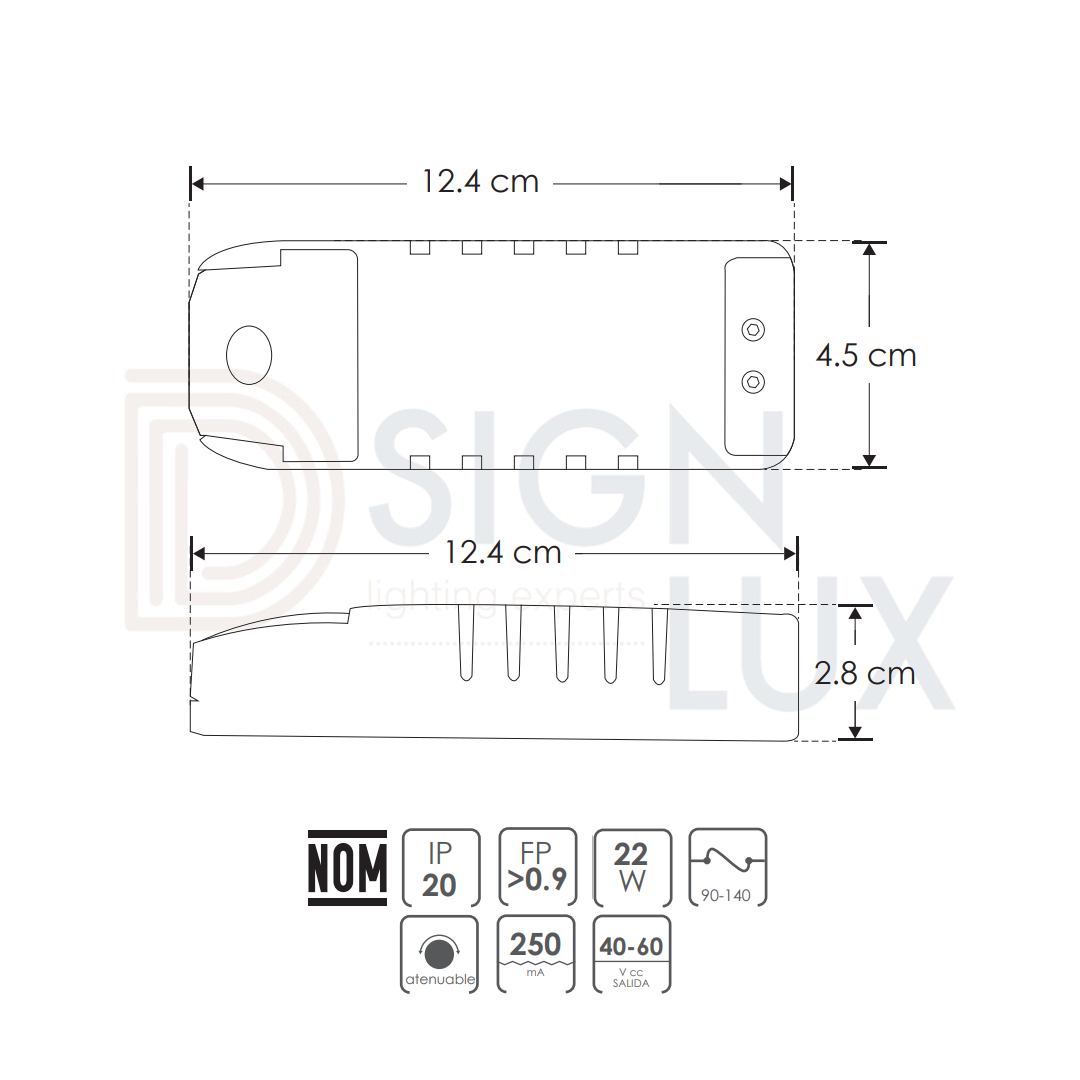 Driver atenuable para luminarios led 22 Watts funciona con atenuadores tipo TRIAC con apagador, nivel de atenuación del 20 al 100%, IP20.