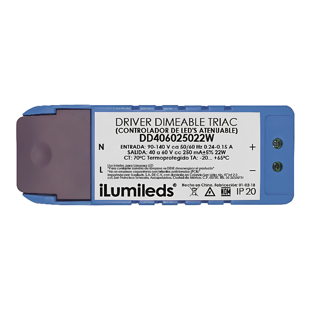 Driver atenuable para luminarios de led (controlador led) atenuado por dimmer triac 22 Watts entrada 90-140V ca salida 40-60V cc 250 ma protección IP20. DD406025022W – ILUMILEDS
