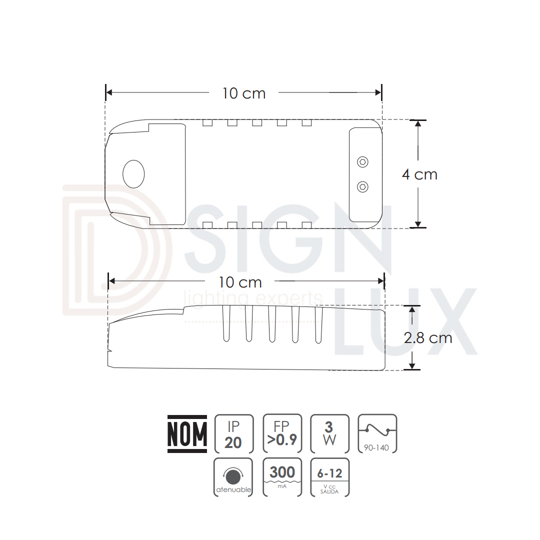 Driver atenuable para luminarios led 3 Watts funciona con atenuadores tipo TRIAC con apagador, nivel de atenuación del 20 al 100%, IP20.