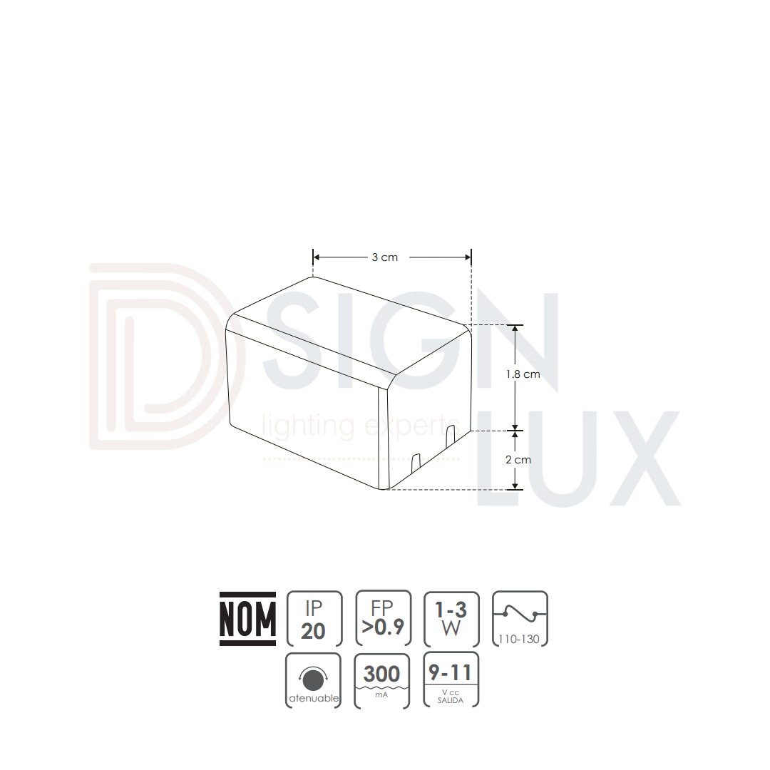 Driver atenuable para luminarios led 1 – 3 Watts funciona con atenuadores tipo TRIAC con apagador, nivel de atenuación del 20 al 100%, IP20.