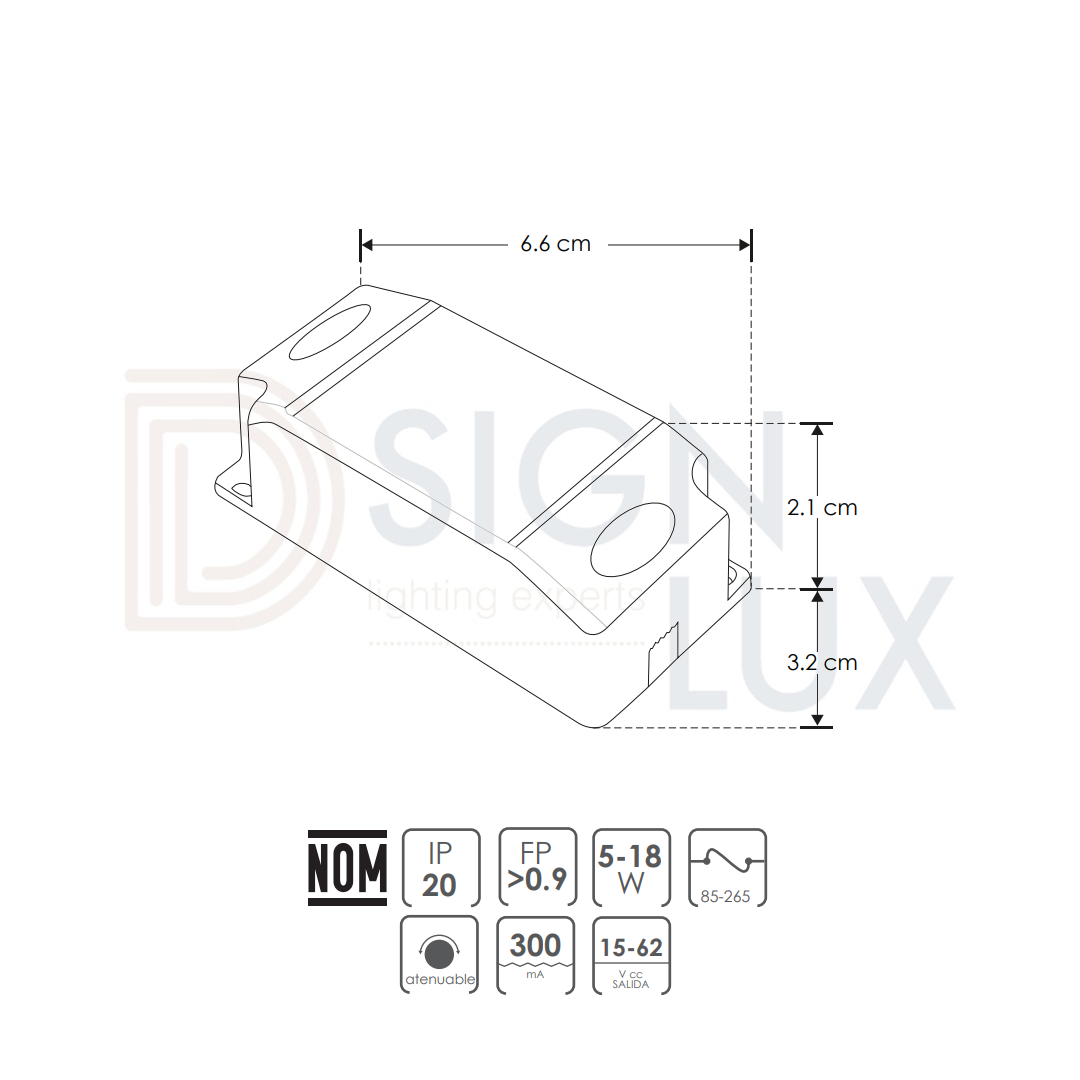 Driver atenuable para luminarios led 5 – 18 Watts funciona con atenuadores tipo TRIAC con apagador, nivel de atenuación del 20 al 100%, IP20.