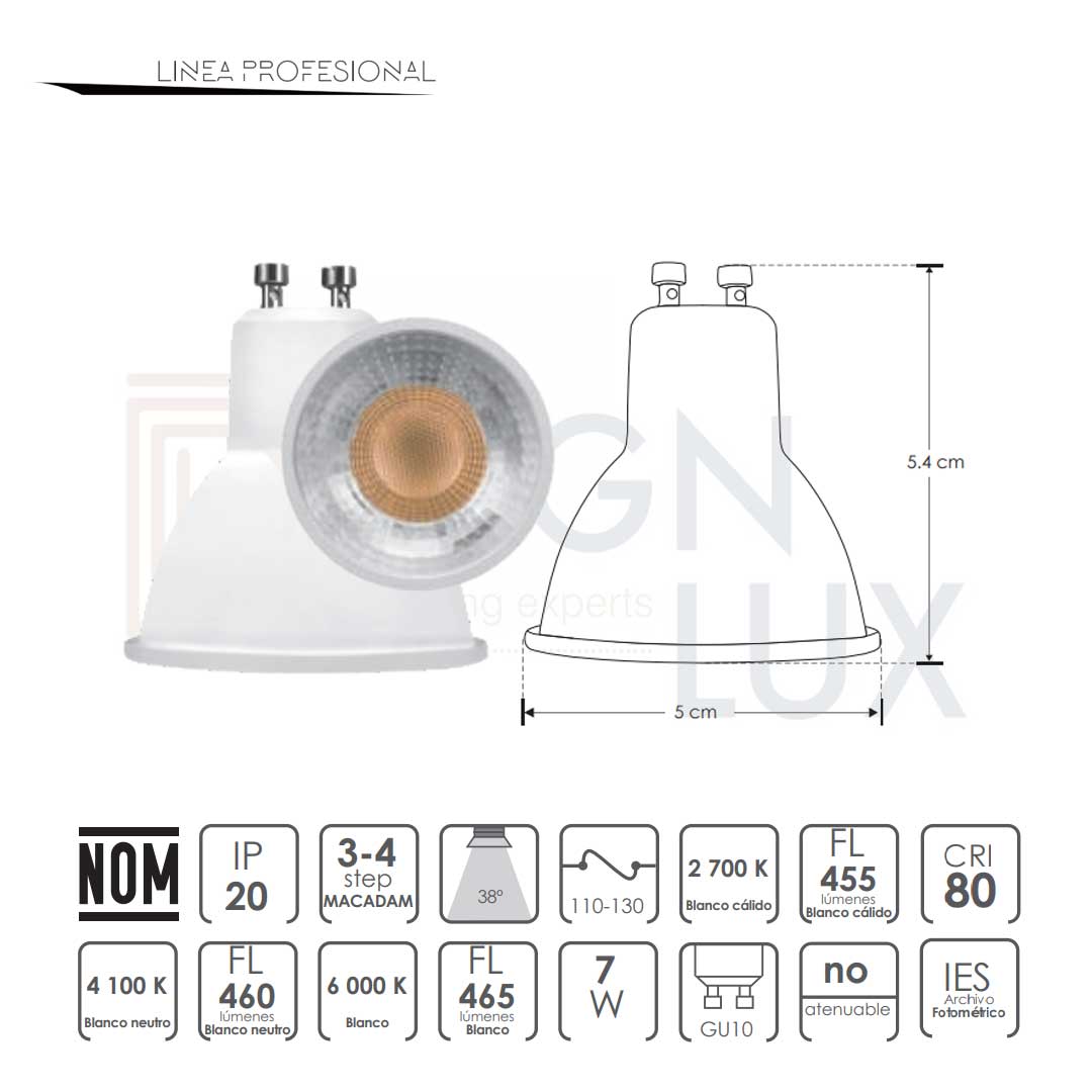 Foco tipo dicroico base GU10, de led, blanco cálido, 7 Watts, óptica 38°, carcasa de plástico cubierta transparente, 110-130V ca, protección IP20. GU107WWWE / GU107WNWE / GU107WWE – ilumileds