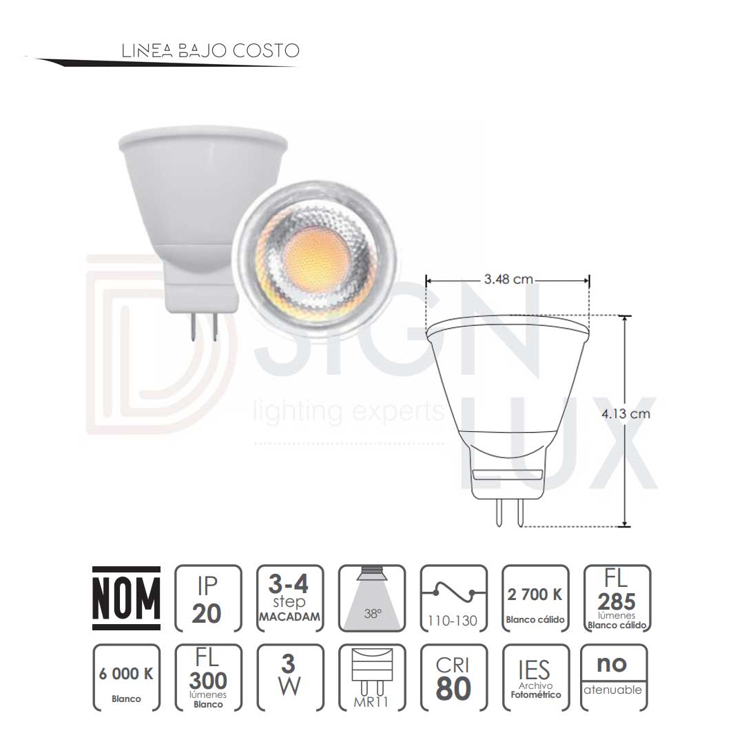 Foco tipo dicroico base MR11, de led, 2700K blanco cálido, 6000K blanco frio, 3 Watts, óptica 38°, carcasa de plástico cubierta transparente, 110-130V ca, protección IP20. MR113WWWE / MR113WWE – ilumileds