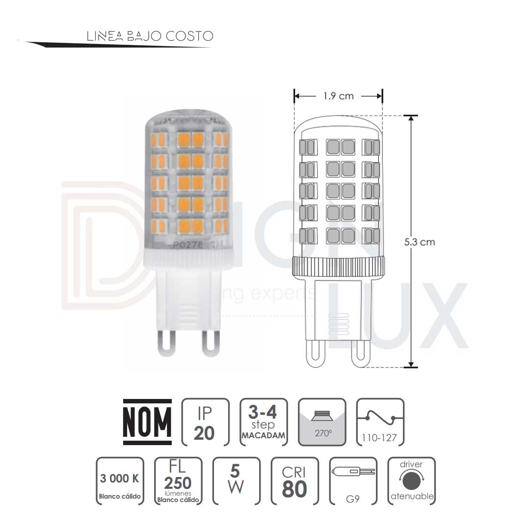 Foco tipo cacahuate base G9, de LED, atenuable, 5 Watts, óptica 270°, cerámica con cubierta de policarbonato, 110 – 127 V ca, protección IP20.
