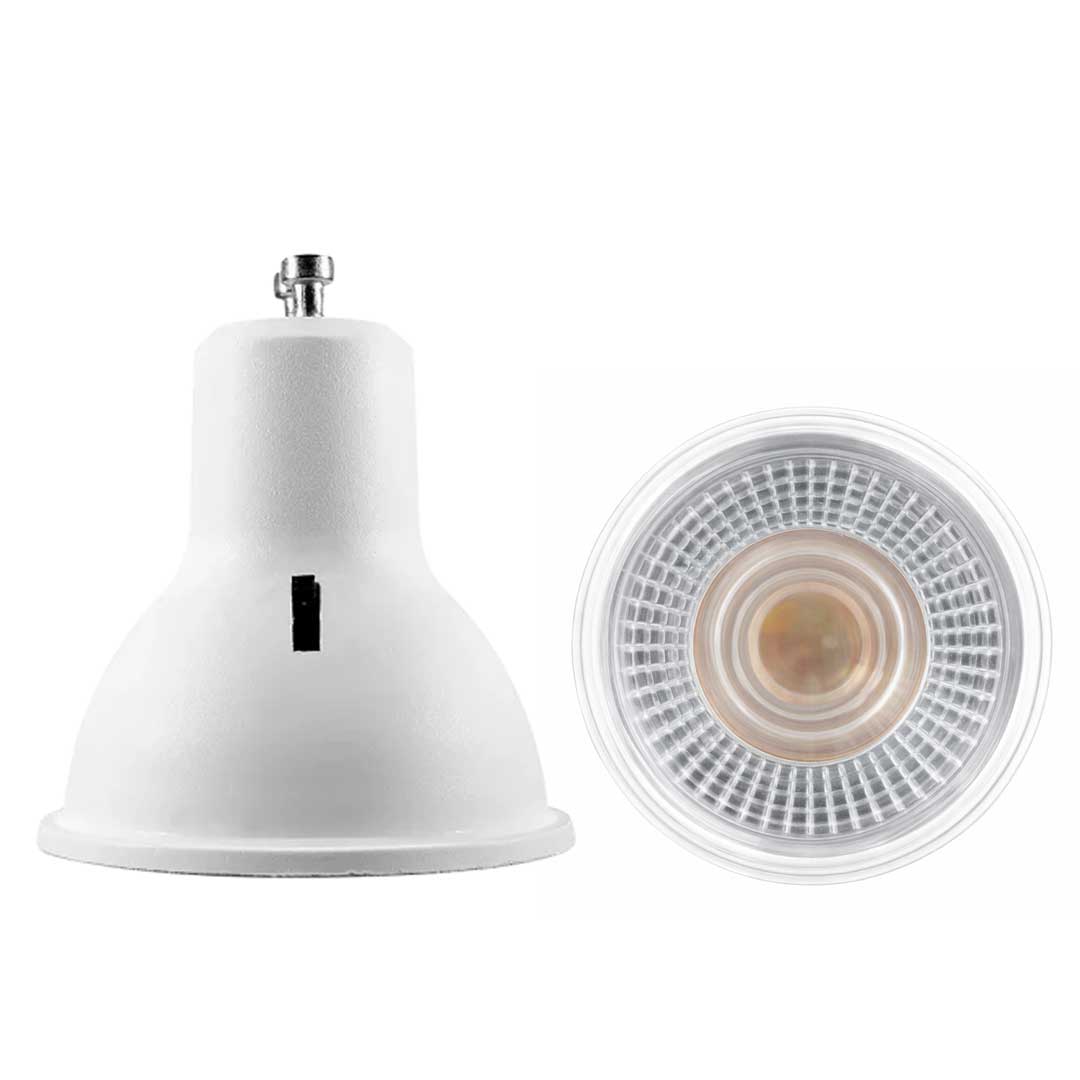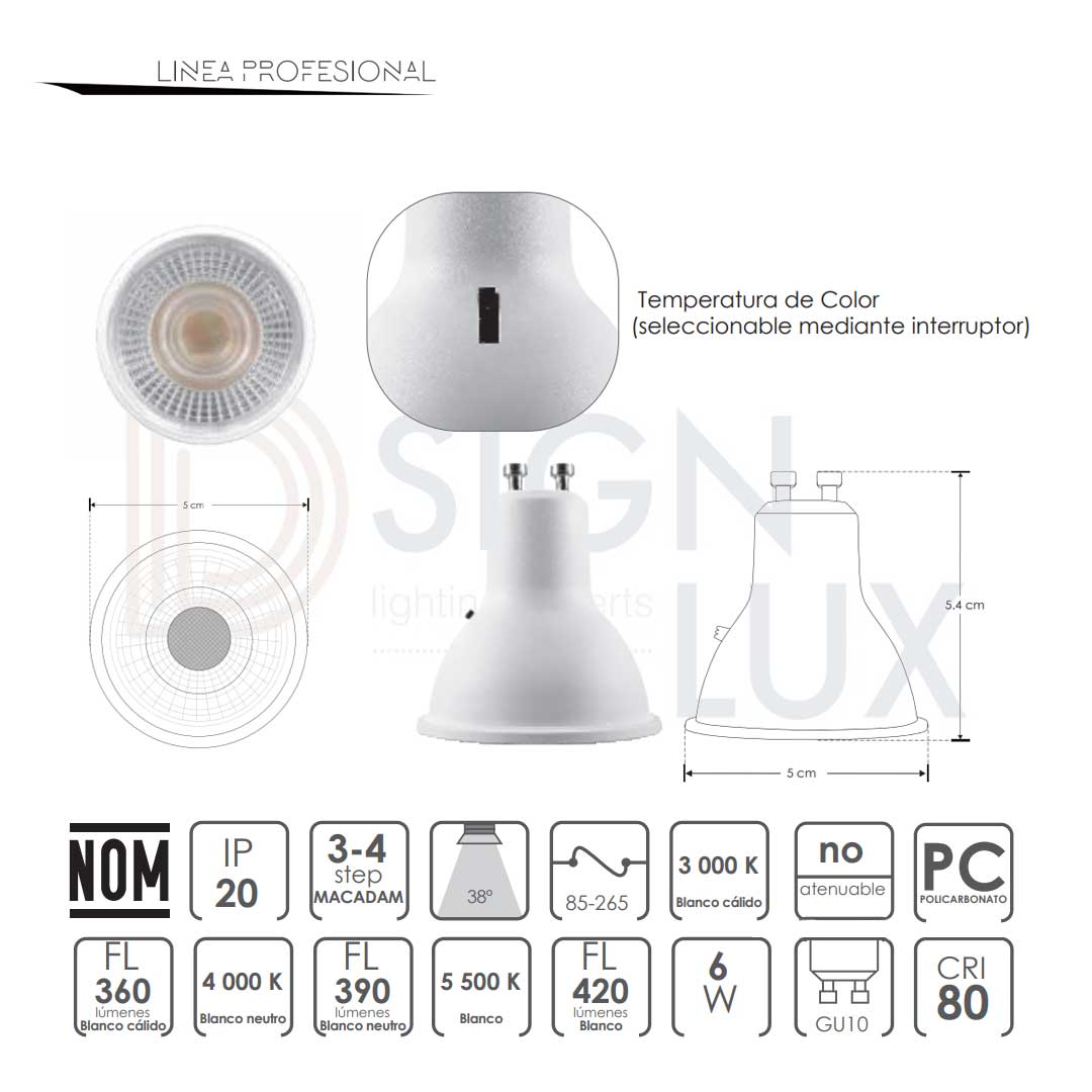Foco tipo dicroico base GU10, de led, CCT, 6 Watts, óptica 38°, carcasa de plástico cubierta transparente, 85 – 265 V ca, protección IP20.