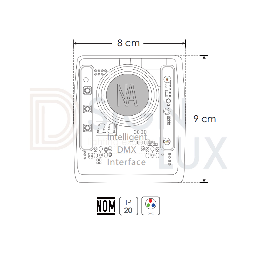 Interfaz DMX 1024 canales de salida, 8 contactos secos y 3 botones display stand-alone 32 y 64 bits protección IP20