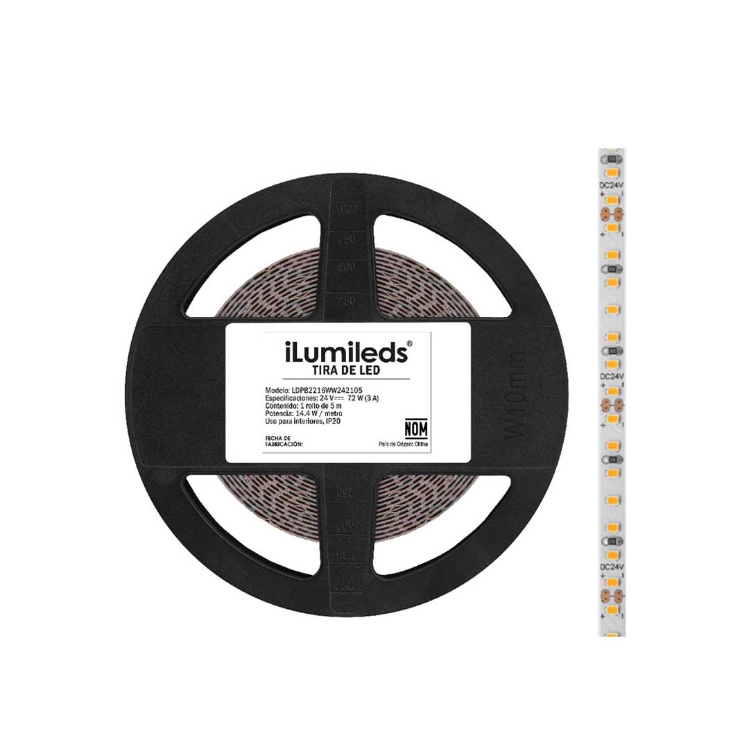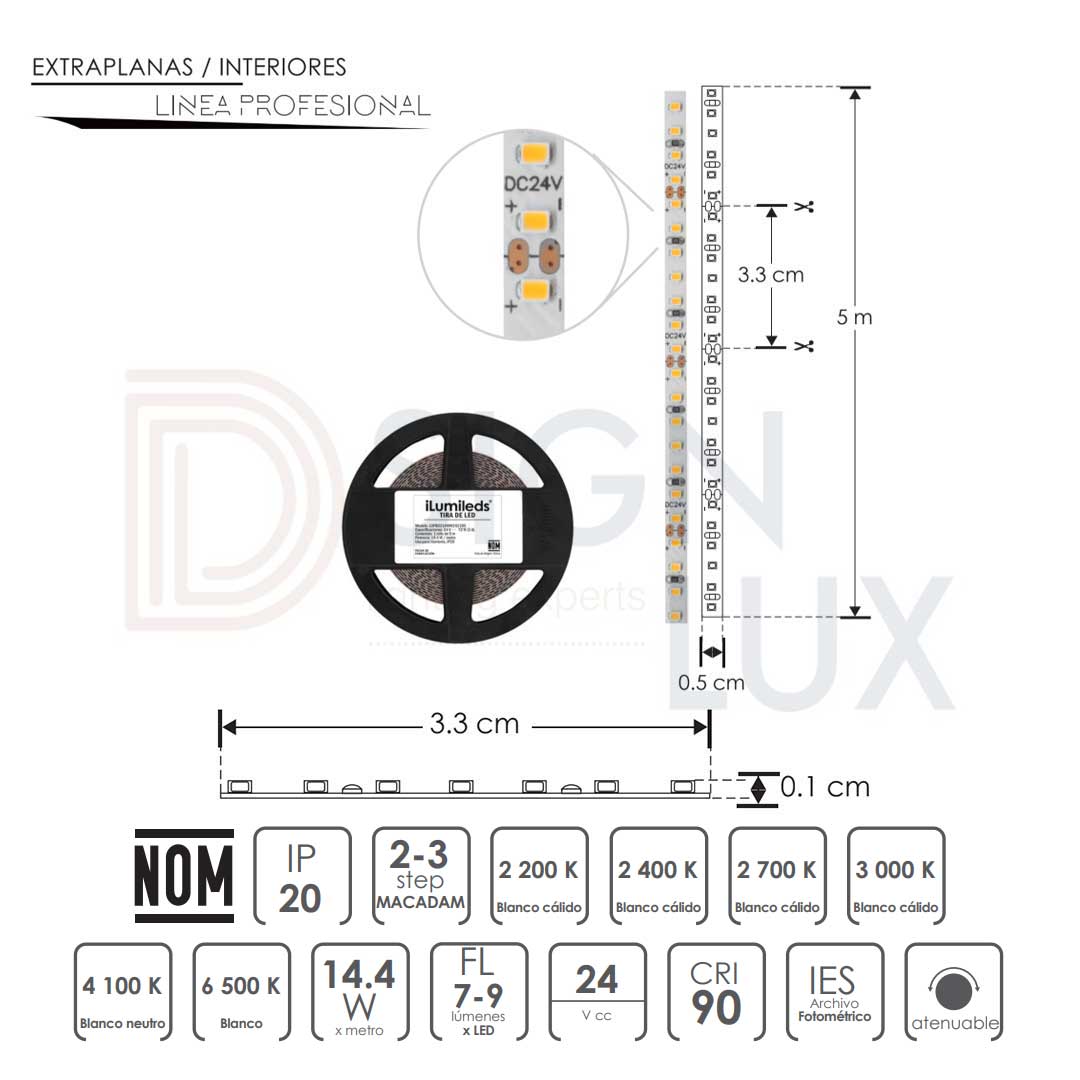 Tira LED extraplana, tipo 2216, rollo de 5m, 210 leds por metro, 14.4W por metro, óptica 120°, pista de cobre acabado blanco con auto adhesivo 3M, Atenuable, CRI 90, PCB 3 oz doble cara, 24V cc, protección IP20. LDPB221622242105 / LDPB221624242105 / LDPB221627242105 / LDPB2216WW242105 / LDPB2216Z242105R / LDPB2216W242105R – Ilumileds