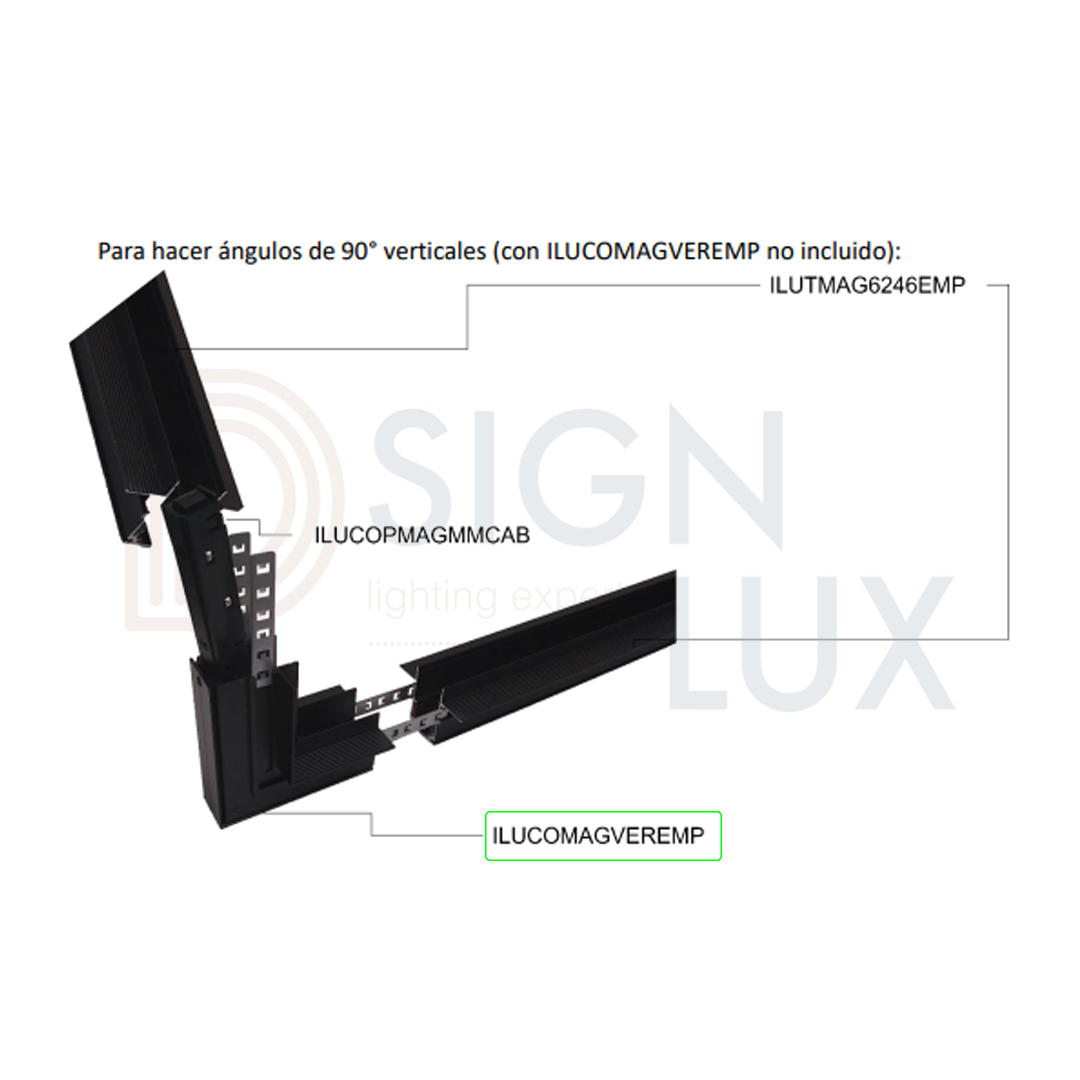 Cople vertical de 90° para riel magnético, acabado negro, protección IP20. ILUTMAG6246EMP. ILUCOMAGVEREMP – ILUMILEDS