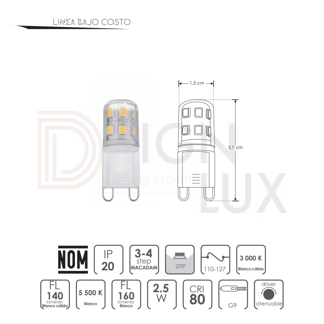 Foco tipo cacahuate base G9, de LED, atenuable ,3000K blanco cálido, 5500K blanco neutro, 5 Watts, óptica 270°, cerámica con cubierta de policarbonato, 110-127V ca, protección IP20. G92.5WWWCE / G92.5WWCE – ilumileds