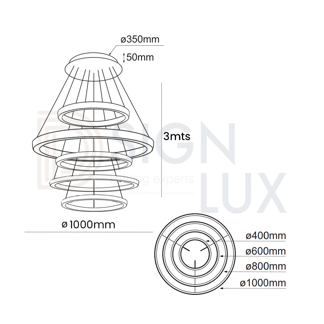 Lámpara colgante led de 3 aros en acabado oro de luz calida de altura ajustable cable de 3mts.
