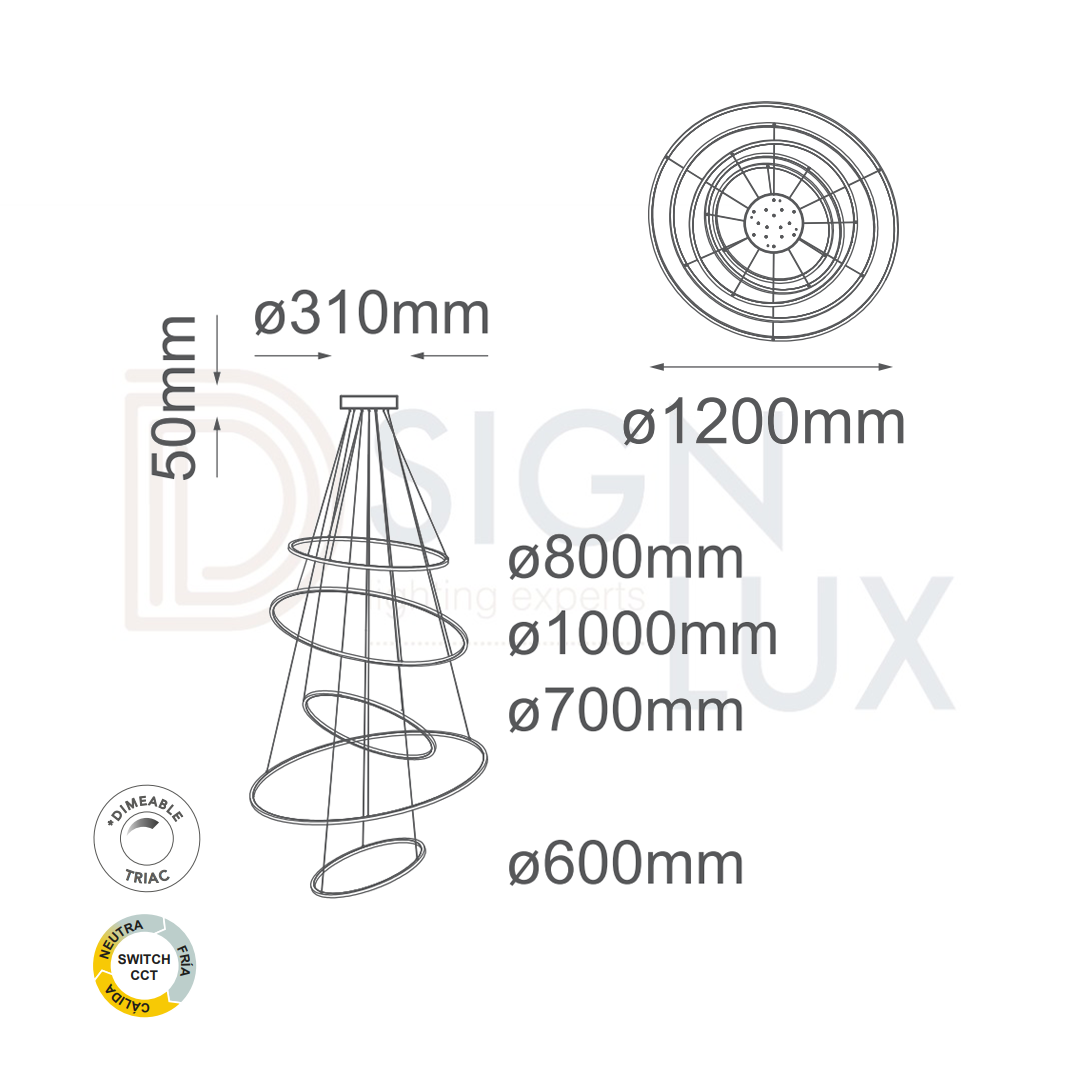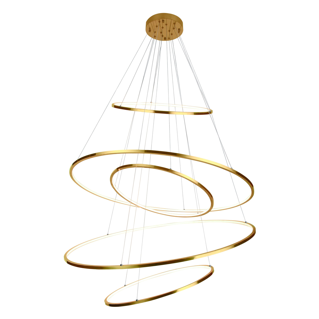 Lámpara colgante, led, 5 aros, decorativa, 5 luces, de acero inoxidable + acrílico, acabado en oro y cromo, 140W, 11200lm, 3000K, 4000K, 6000K, 90-130V, ø1200mm, cable de 3m, KREIS –Q24485-GD – Q24485-CH – QUOR
