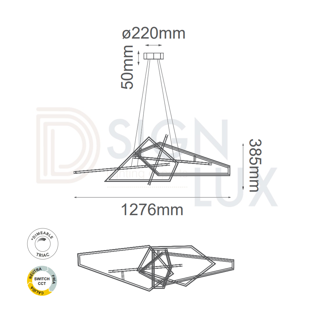 Lámpara colgante, led 5 marcos, acero y acrilico, acabado oro y cromo, atenuable, 90-130V, 111W, 8880lm, L1276*W385mm, cable de 3mts. PABLO – Q28120-CH / Q28120-GD – QUOR