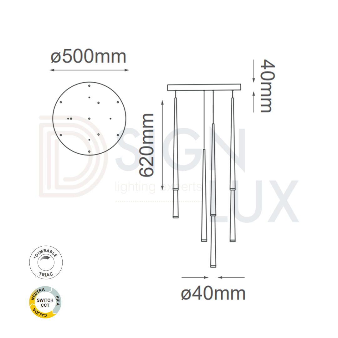Lampara colgante led atenuable cascada 5 luces con tres cambios de luz con cable de 3m