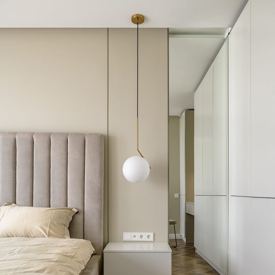 Lámpara de pared de esfera de metal y cristal opalino en acabado oro antiguo.