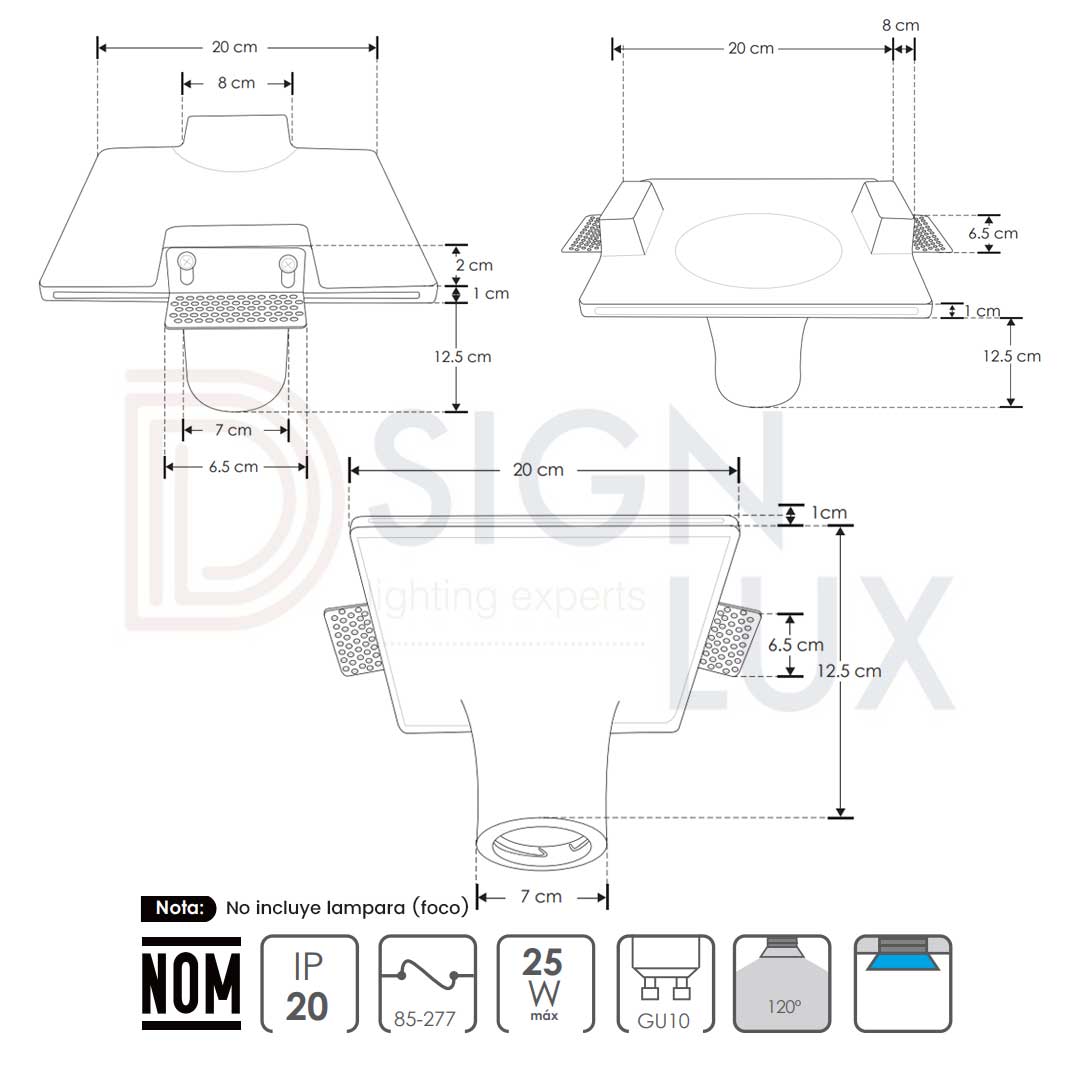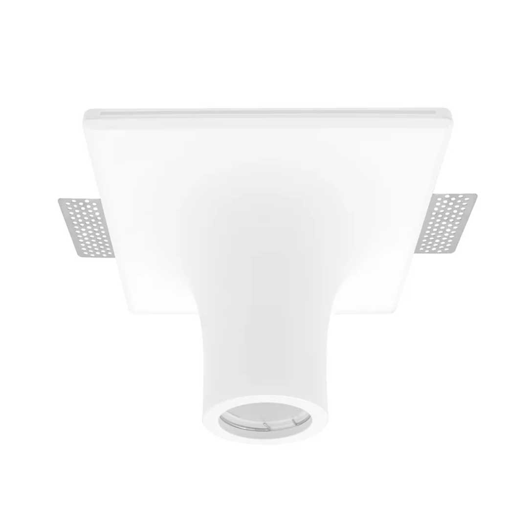 Lámpara de empotrar en techo tipo trimless, de yeso acabado blanco, base GU10 (foco no incluido), 25W máx., 85-277 V ca, óptica 120°, protección IP20. Brant Yeso – ILUEURTRIM6522W – Ilumileds