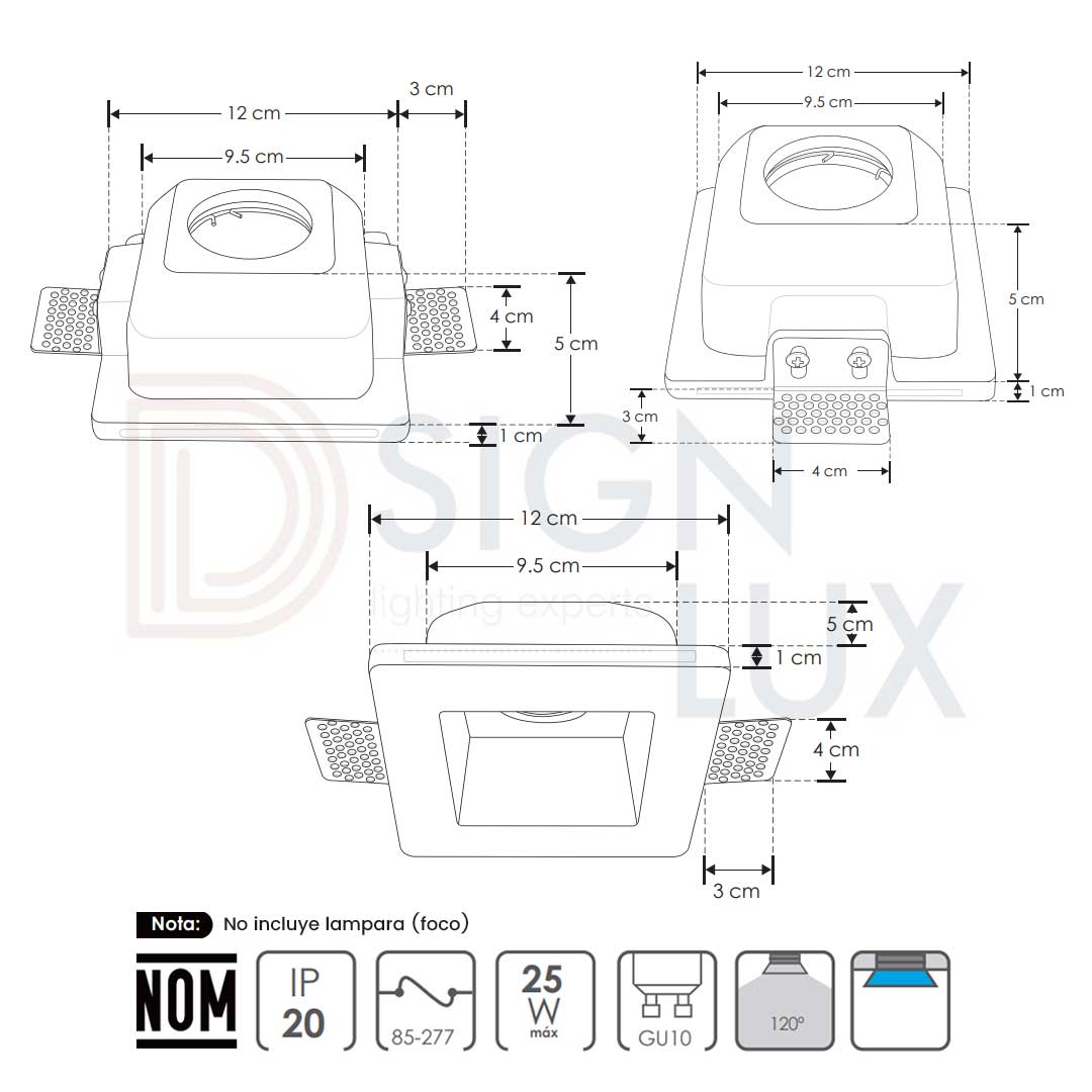 Lámpara de empotrar en techo, tipo trimless, de yeso acabado blanco, base GU10 (foco no incluido), 25W, 85-277 V ca, óptica 120°, protección IP20. Brant Yeso – ILUEURTRIM6501W – Ilumileds