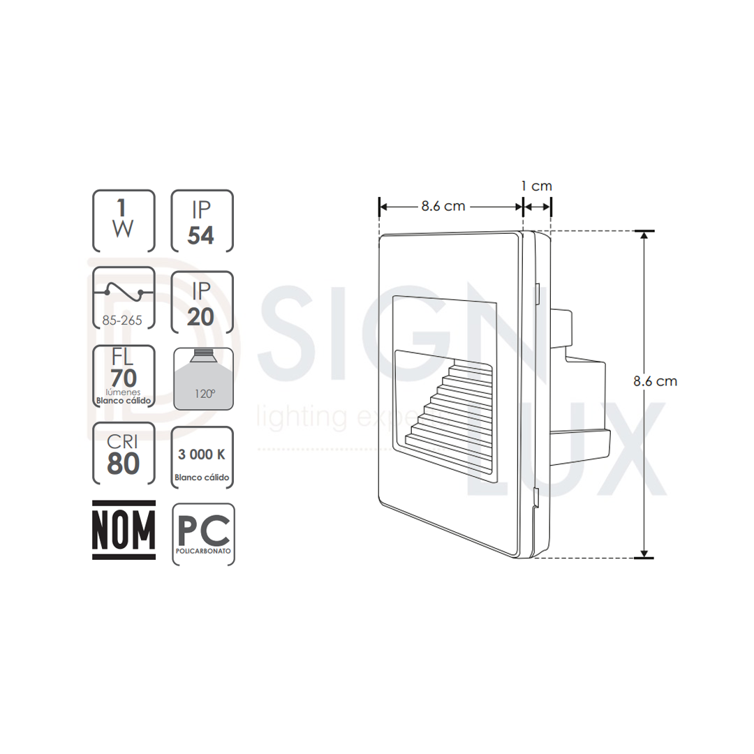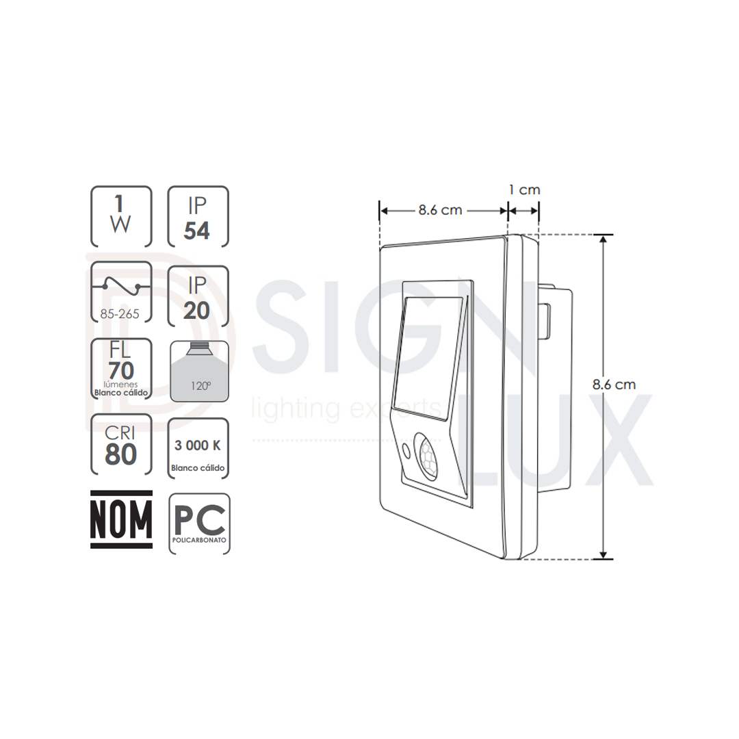 Luminario de pared con sensor de movimiento, de led, blanco cálido, 1 Watt, salida de luz directa inferior, de sobreponer, policarbonato acabado blanco, 85-265 V ca, protección IP54 ILUPCSTEPWE – ILUPCSTEPSWE – ILUMILEDS