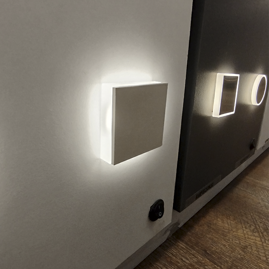 Luminario arbotante led cuadrado luz blanco cálido de empotrar con efecto simétrico lateral.