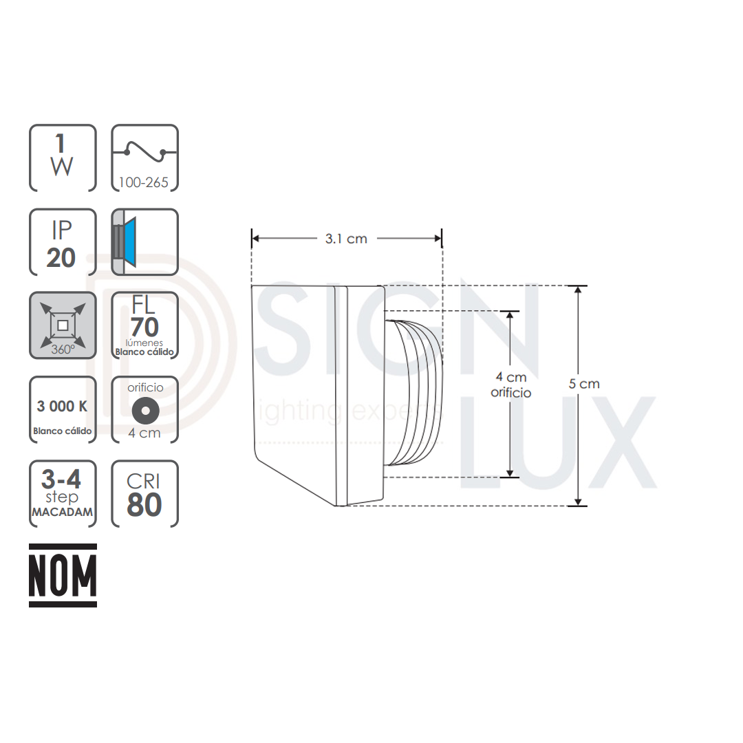 Luminario de pared, de led, blanco cálido, 1 Watt, óptica 360°, cuadrado, de empotrar, aluminio y acrílico acabado blanco, 100-265V ca, protección IP20 ILULD07446CE – ILUMILEDS