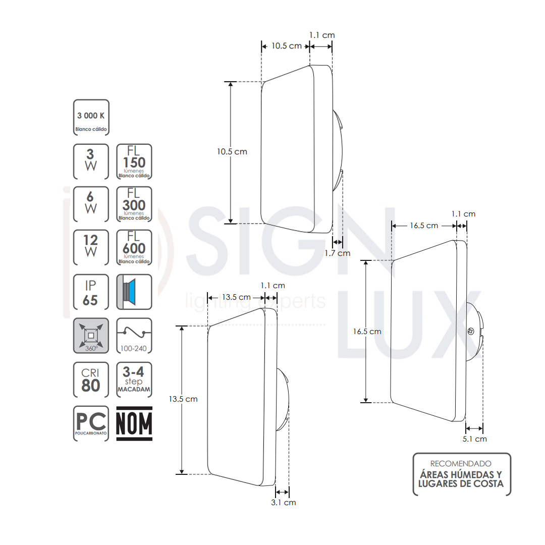 Luminario de pared, de LED, blanco cálido, 3 Watts, cuadrado salida trasera, de sobreponer, policarbonato acabado negro, 100-240V ca, protección IP65 – ILUPC4440SSBE – ILUPC4440SBE – ILUPC4440BE – ILUMILEDS