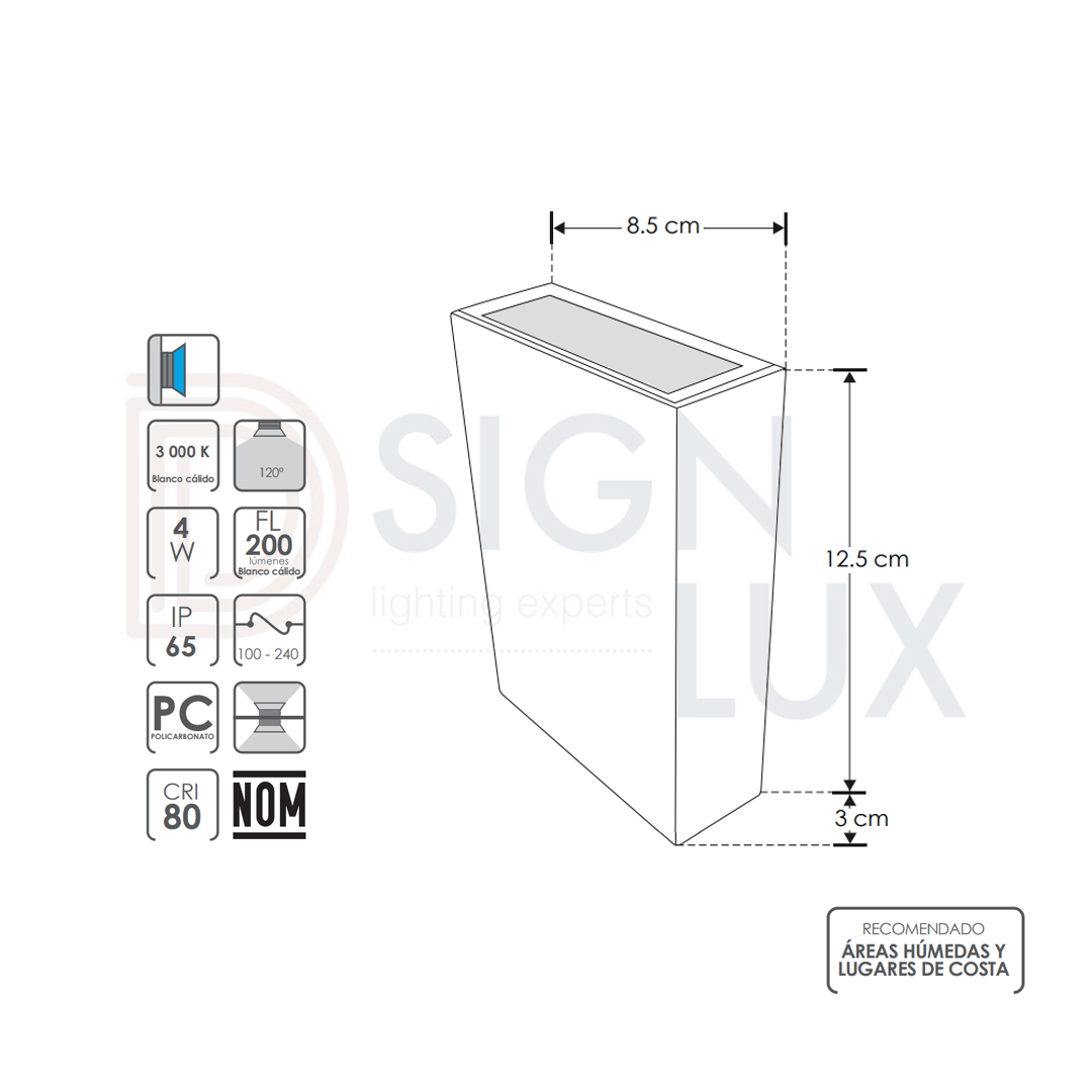 - Ángulo de iluminación: 120° (Efecto simétrico, salida de luz superior e inferior)