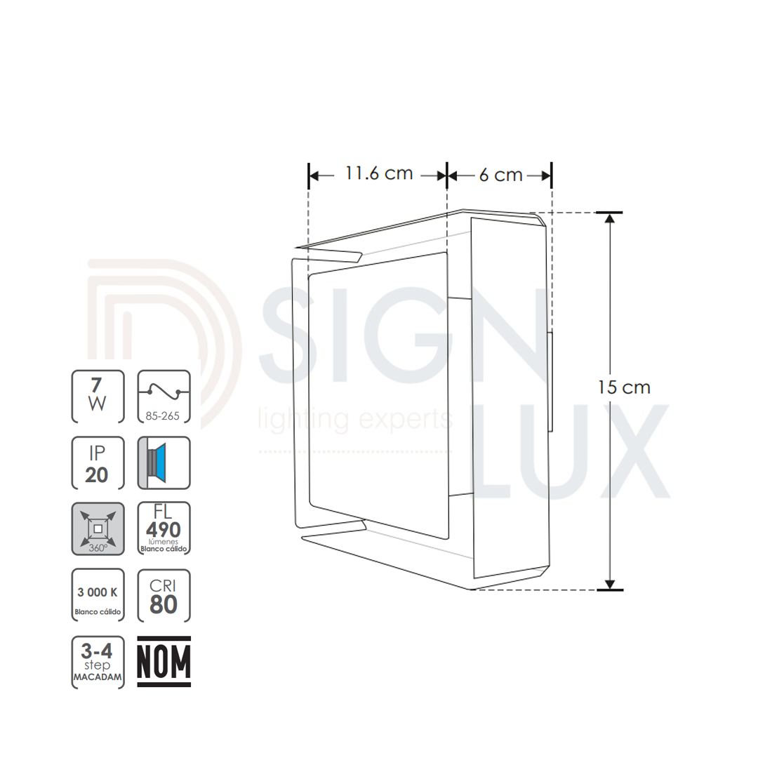 Luminario de pared, de led, blanco cálido, 7 Watts, cuadrado salida de luz frontal, de sobreponer, acero acabado blanco, 85-265V ca, protección IP20 LED6066E – ILUMILEDS