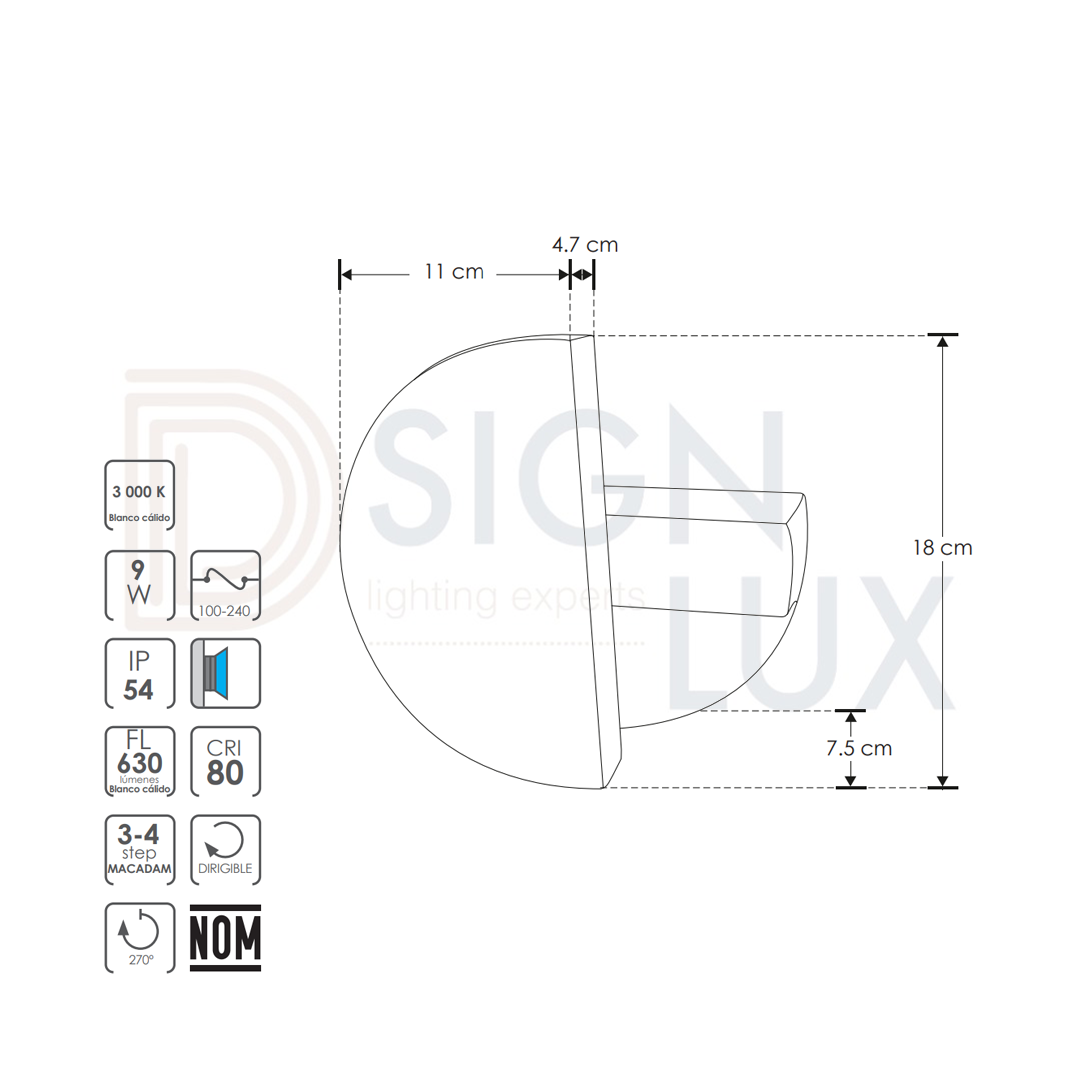 - Ángulo de iluminación: 270° Efecto asimétrico, salida de luz indirecta dirigible
