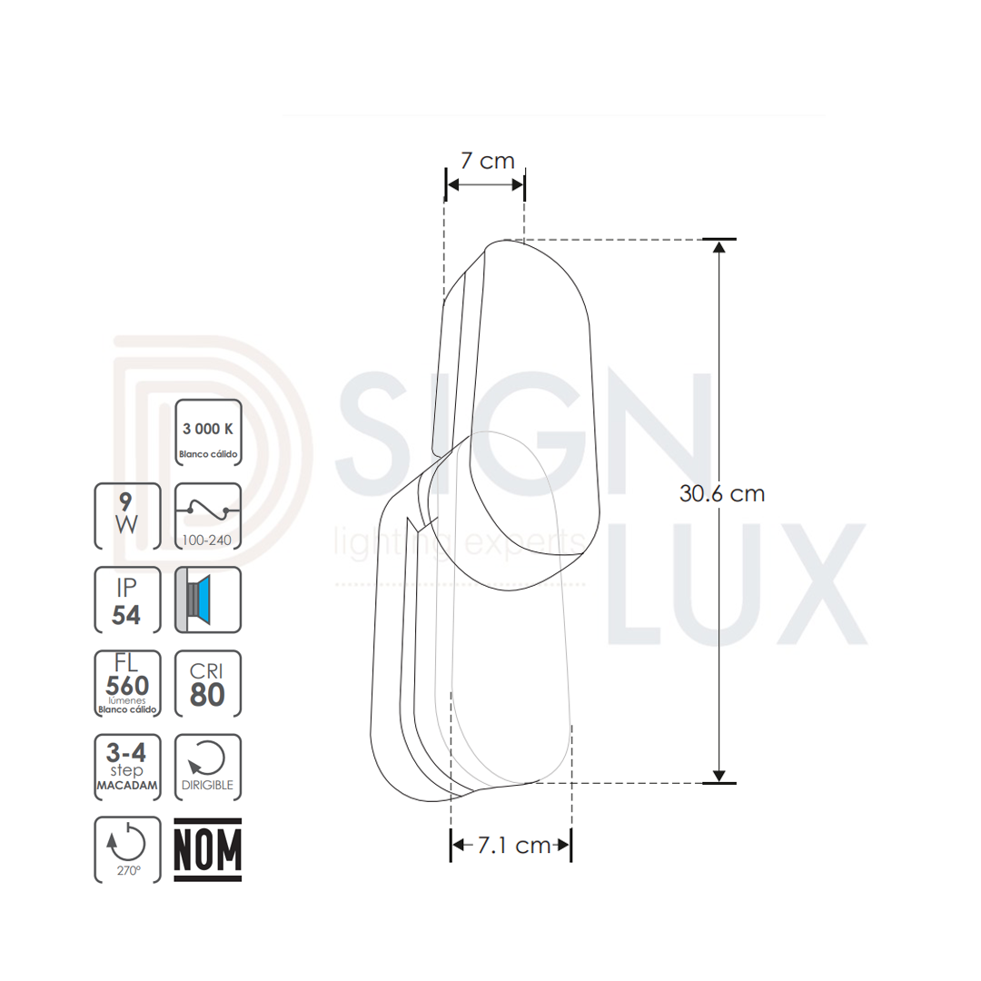 Luminario de pared, de led, blanco cálido, 9 Watts, simétrico salida de luz indirecta rotativo, de sobreponer dirigible, aluminio acabado blanco, 100-240V ca, protección IP54 LED1874MAW – ILUMILEDS