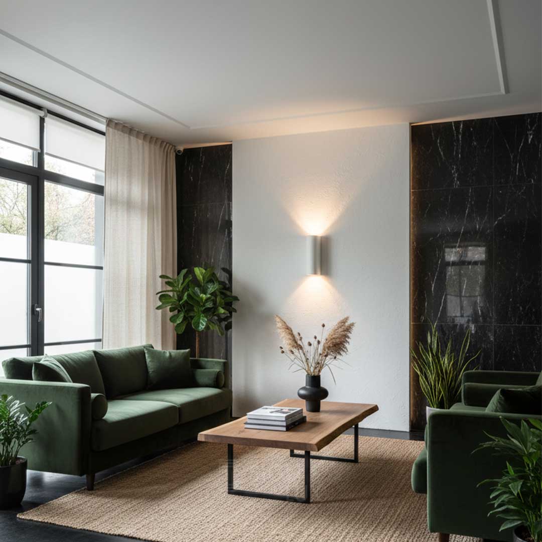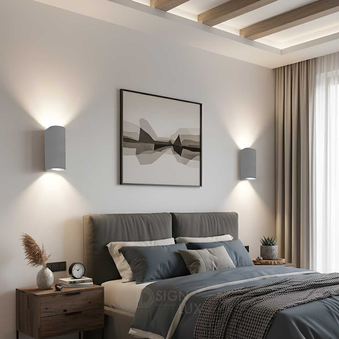 Lámpara de pared, de concreto gris o yeso blanco, 2 bases GU10 (focos no incluidos), 25W máx. cada base (50W total), 277 V ca, óptica 120°, IP20. Váser – ILUEUR8016CG / ILUEUR8016YW – Ilumileds
