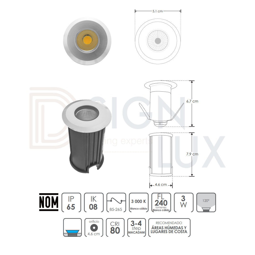 Luminario de piso, de led, blanco cálido, 3 Watts, óptica 120°, redondo, de empotrar, aluminio incluye housing, 85-265V ca, protección IP65. ILUEP3WWW – ILUMILEDS