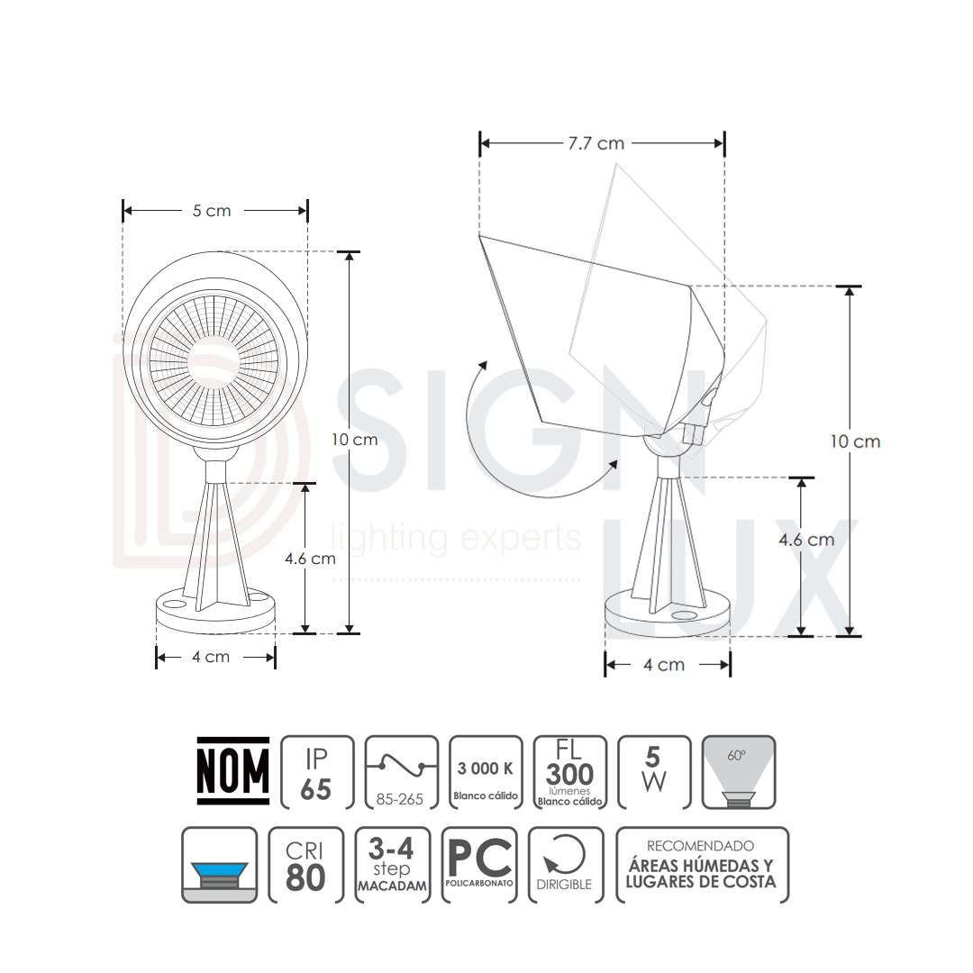 Luminario de piso, led, para jardín, blanco cálido, 5 Watts, óptica 60°, de sobreponer, policarbonato acabado negro incluye base de fijación, 85-265V ca, protección IP65. ILUBASPC5WWW – ILUMILEDS