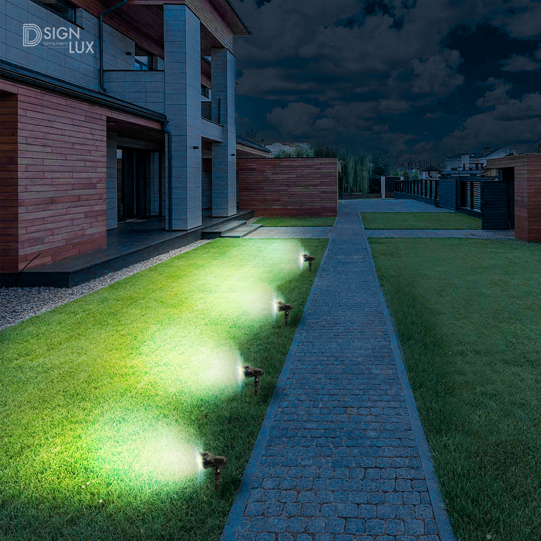 Luminario de piso LED para exterior con estaca con visera de sobreponer en luz blanco calido, 7W