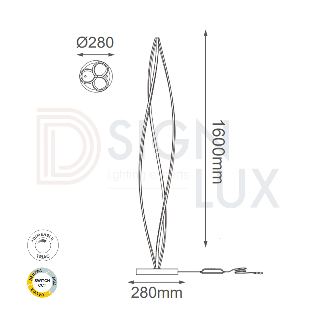 Lampara de piso, LED integrado, decorativa, de metal y acrílico, en acabado negro revolver / oro, atenuable, 3500lm, 127V, 60W, Switch CCT 3000K-4000K-6000K, CRI >85. AKI Q98253-GD / Q98253-GNB – QUOR