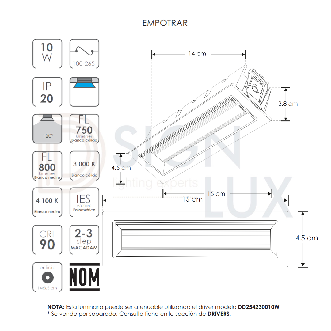 Driver atenuable para luminarios led 10 Watts funciona con atenuadores tipo TRIAC con apagador, nivel de atenuación del 20 al 100%, IP20.