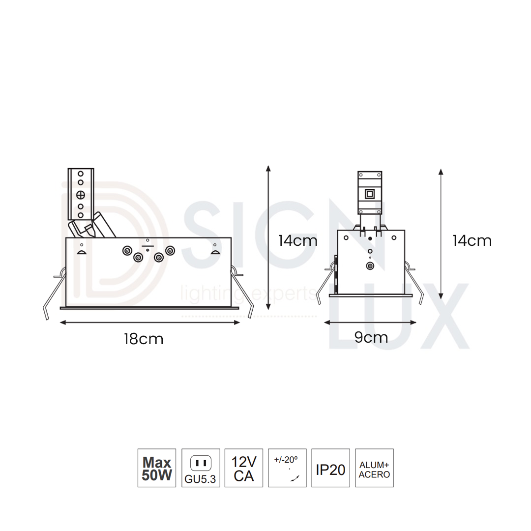 Luminario downlight dirigible cuadrado para empotrar en techo de aluminio y acero, Base GU10, 50W, 127V, IP20