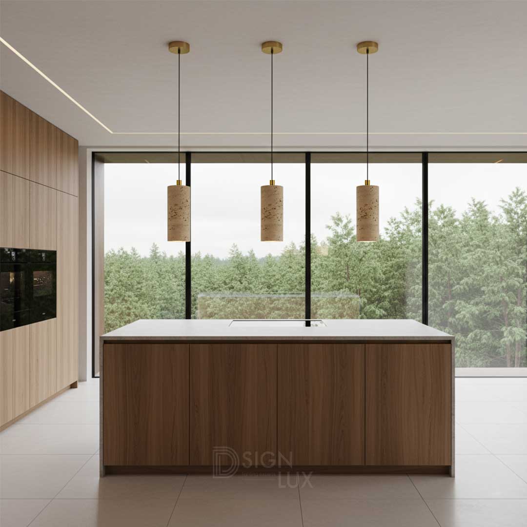 Lámpara colgante, para suspender en techo, de travertino acabado beige, base GU10 (foco no incluido), 35W max., 85-277 V ca, óptica 120°, protección IP20. Canaletta – ILUEURSC18CMGU10TB – Ilumileds