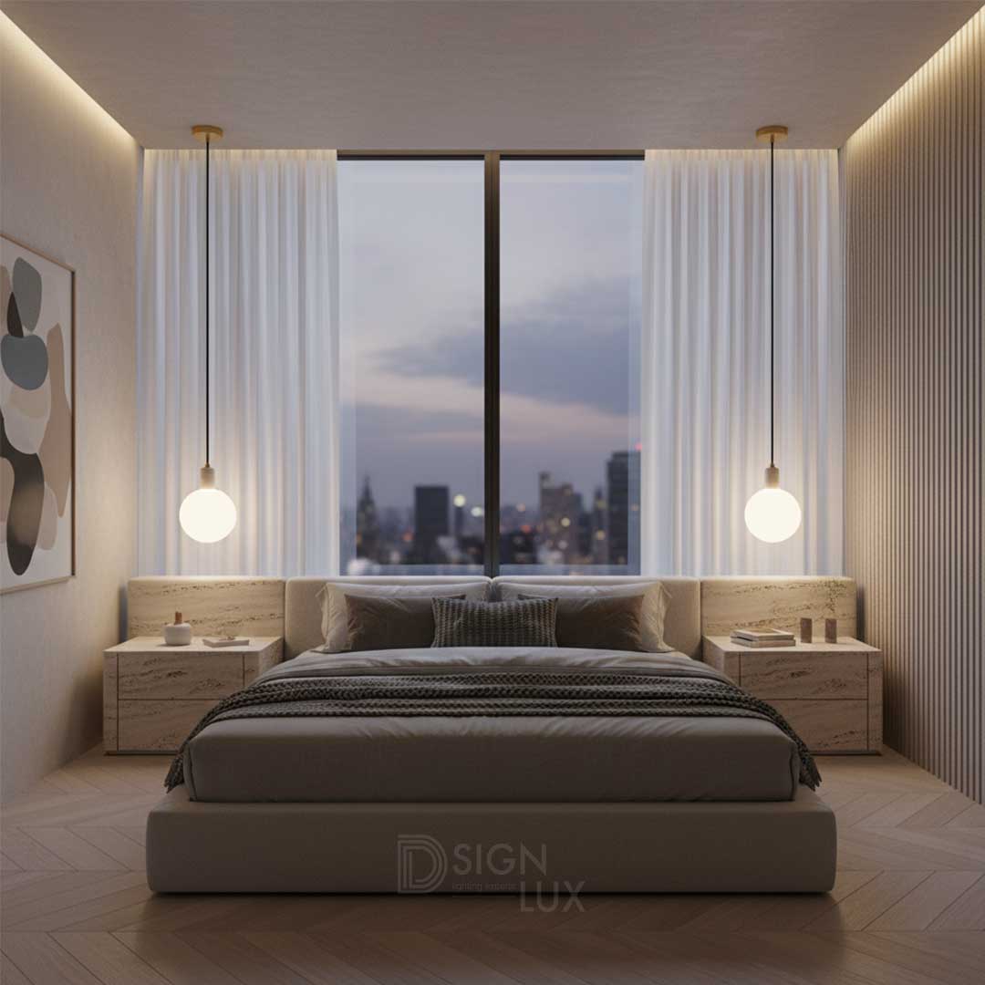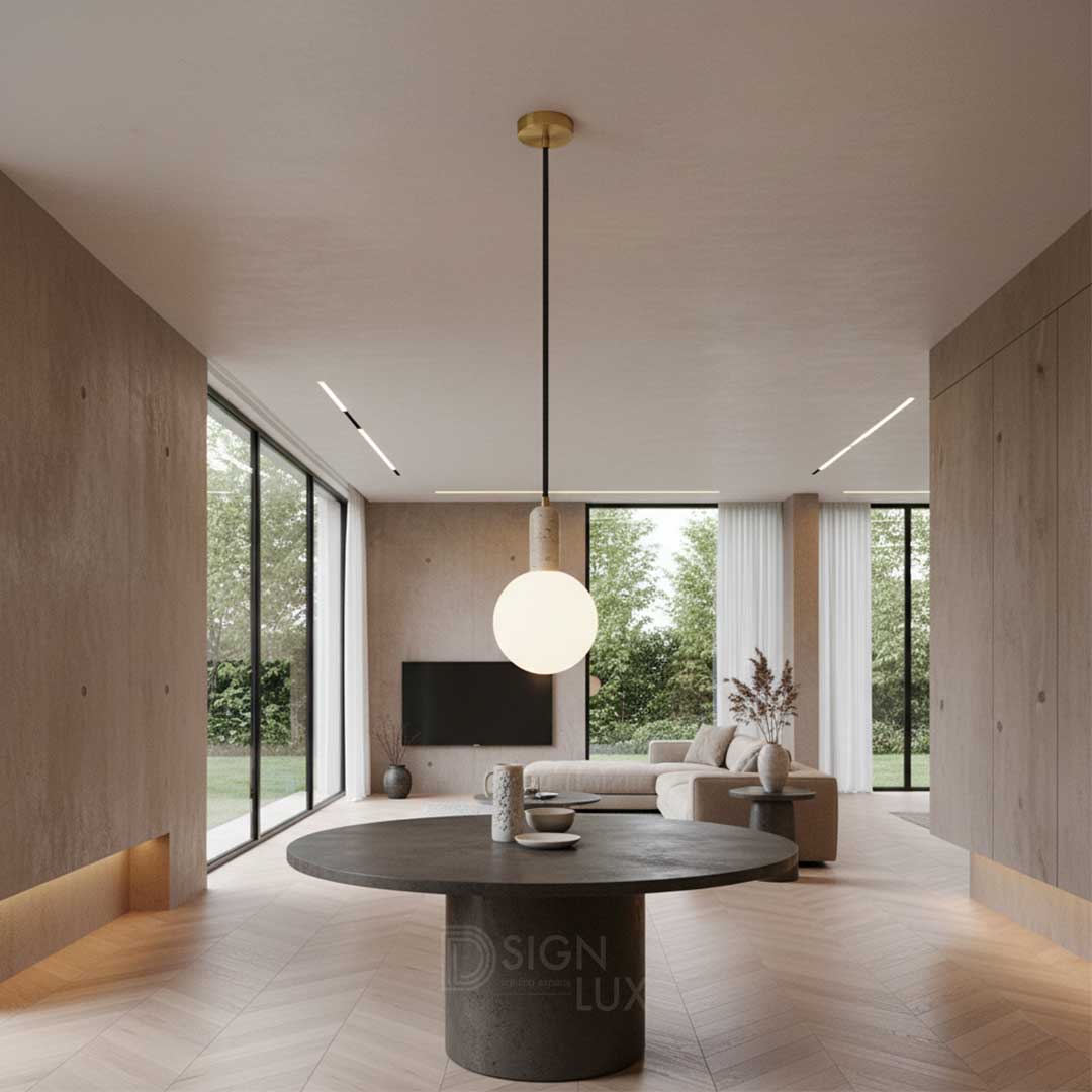 Lámpara colgante para suspender en techo de travertino beige con esfera de cristal difuso, base G9 (sin foco), 15W máx., 85–277 V ca, óptica 360°, protección IP20. Loggia – ILUEURS1ESFG9TB – Ilumileds
