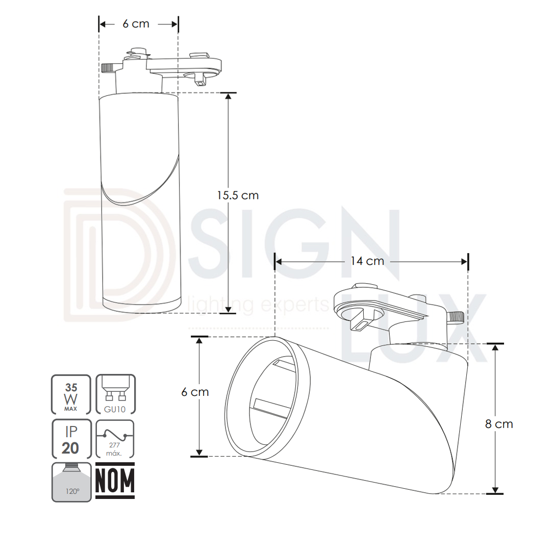 Luminario para lámpara tipo dicroica GU10, 277 V ca 35W máximo, cilíndrico, para riel electrificado, aluminio negro / blanco, no incluye lámpara, protección IP20. ILUTLAGU1001W / ILUTLAGU1001B – ILUMILEDS