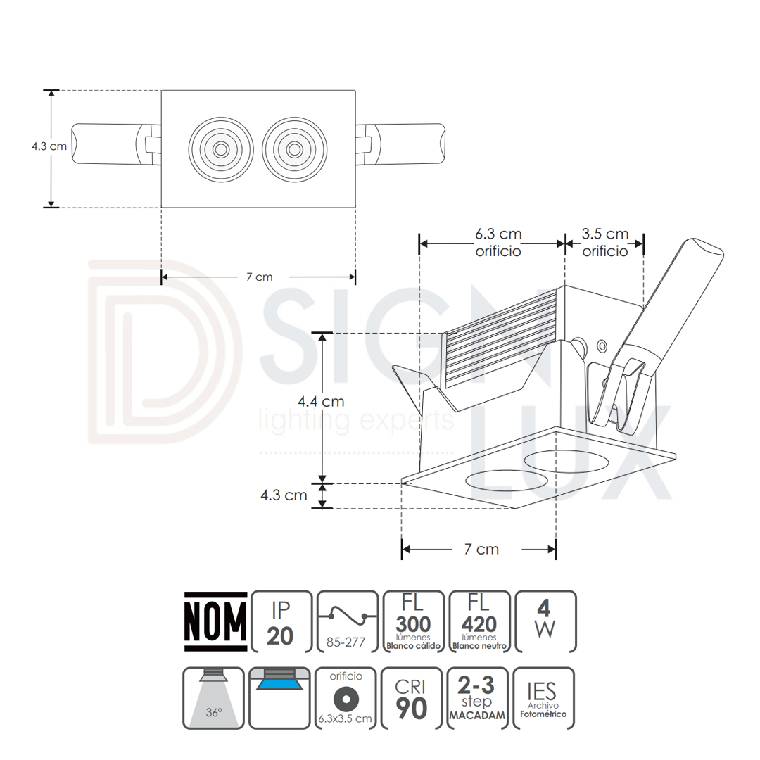 Luminario downlight LED rectangular puntual de techo para empotrar marca Osram 2 luces 4W óptica de 36°