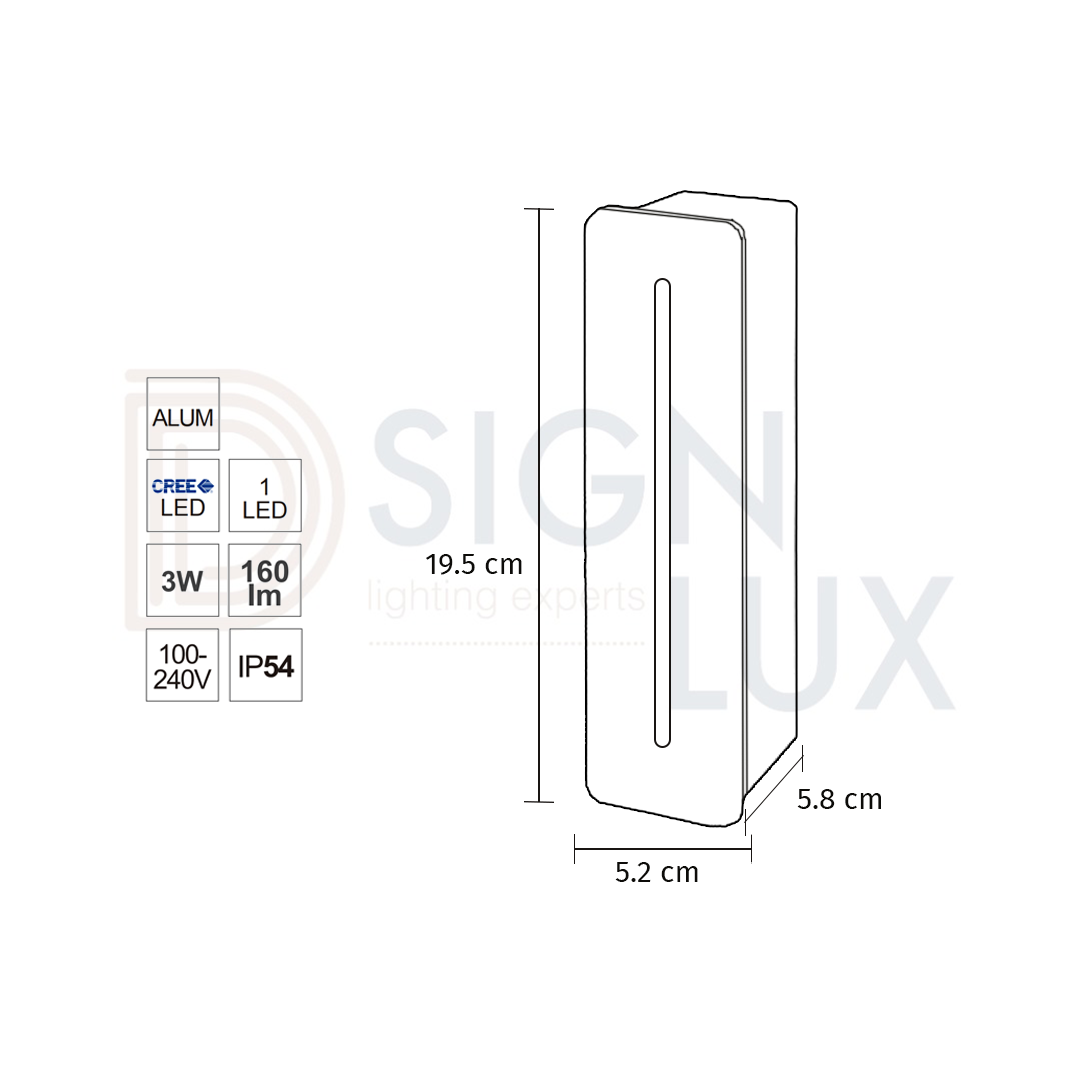 Lámpara de empotrar en pared, CREE LED, 160Lm, acabado blanco -01 y gris -03. Material Aluminio, Consumo 3W, Voltaje de Operación 110-240V, Temperatura de Color Blanco Cálido 3000K, IP54. Serie SIGN – 07-1276-03 / 07-1276-01 – ASTRO LED