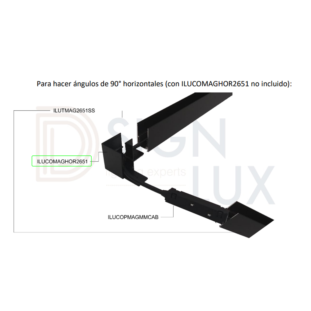 Cople horizontal de 90° para riel magnético ILUTMAG2651SS, acabado negro, IP20.